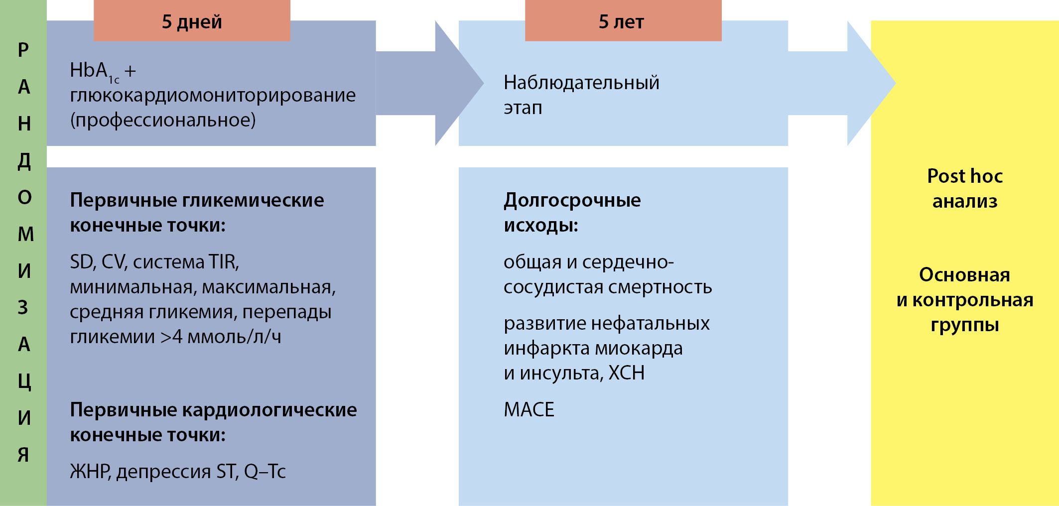 Синхронное глюкокардиомониторирование выполнено в течение 5 дней с помощью cистемы мониторирования глюкозы iPro2 (MMT-7745), iPro2 (Medtronic, США) и холтер-регистратора EVENT-рекордера DR200/E (NorthEast Monitoring, США). Перед проведением НМГ у пациентов определен уровень HbA1c методом высокоэффективной жидкостной хроматографии в соответствии стандартом NGSP (анализатор гемоглобина DS5 VARIANT®II TURBO, BIO-RAD, США). Наблюдение за пациентами в течение 5 лет проводилось на консультативных приемах, при повторных госпитализациях, а также с помощью Интернет- и мобильной связи.
