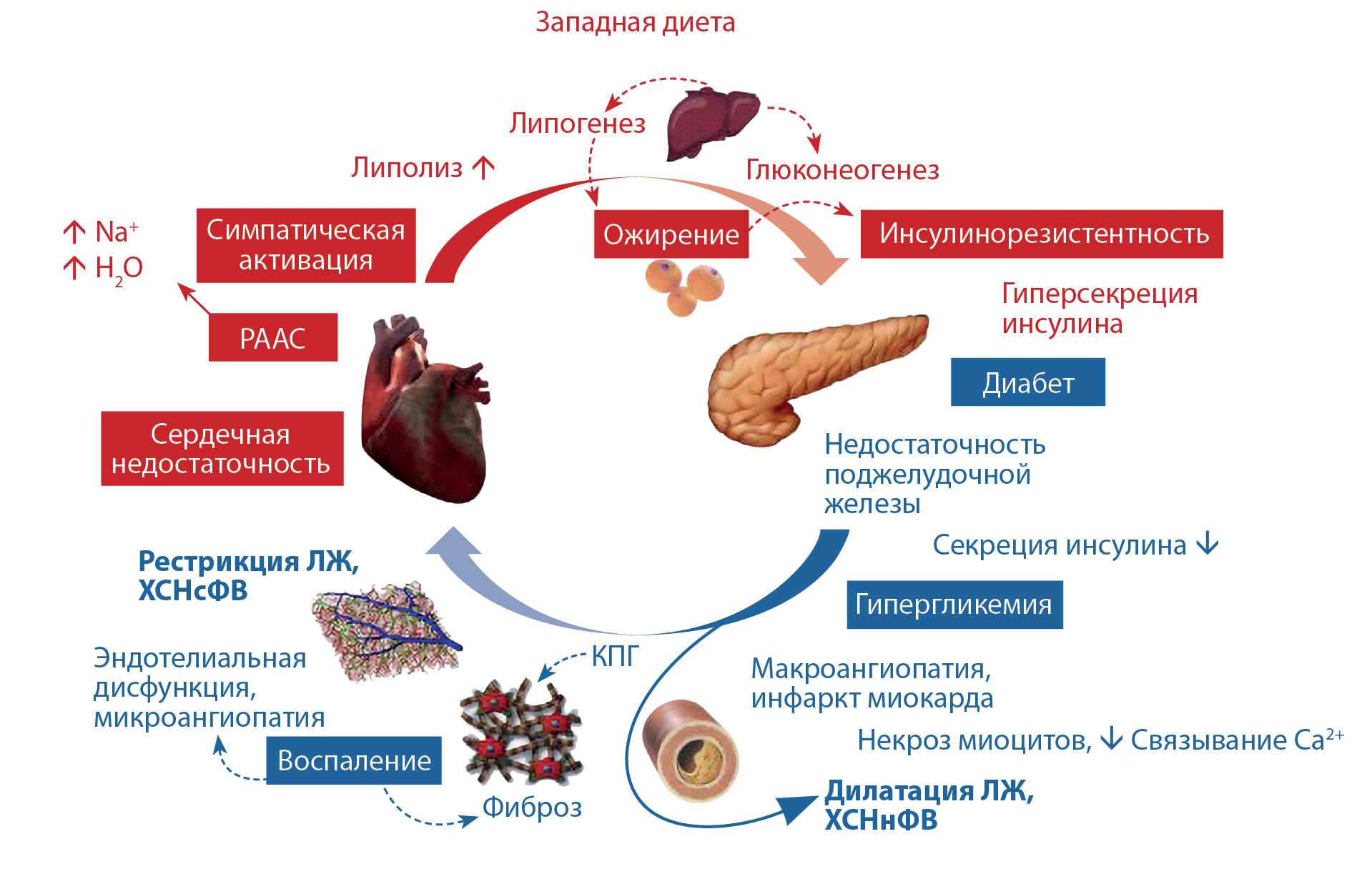 Важный механизм, посредством которого гипергликемия может способствовать развитию ХСН, связан с повышенной выработкой конечных продуктов гликирования (рис. 1) [12]. Подвергшиеся гликированию белки и углеводы взаимодействуют со специфическими рецепторами конечных продуктов гликирования и активируют их, запуская выработку активных форм кислорода, которые, в свою очередь, вызывают воспаление как в миокарде, так и в микроциркуляторном русле, инициируя и поддерживая процессы эндотелиальной дисфункции. Самоподдерживающиеся процессы окислительного стресса и воспаления приводят к апоптозу кардиомиоцитов [17], дисфункции митохондрий, в результате чего снижается выработка аденозинтрифосфата, выполняющего основную энергетическую роль в клетке, снижается поглощение кальция саркоплазматическим ретикулумом, что уменьшает силу сокращения сердца, то есть формируется и закрепляется отрицательный инотропный эффект [21]. Высокие концентрации конечных продуктов гликирования приводят и к органическим изменениям — развивается интерстициальный фиброз миокарда. Все эти факторы в совокупности определяют высокие риски развития ХСНсФВ [17]. С другой стороны, патогенез ХСНсФВ тесно связан и с классическими путями развития ХСН — активацией ренин-ангиотензин-альдостероновой системы, приводящей к задержке ионов натрия и воды, а также симпатической нервной системы, стимулирующей липолиз, что в сочетании с диетой «по западному образцу» и ожирением приводит к инсулинорезистентности или усугубляет уже имеющуюся, тем самым замыкая порочный круг [12].