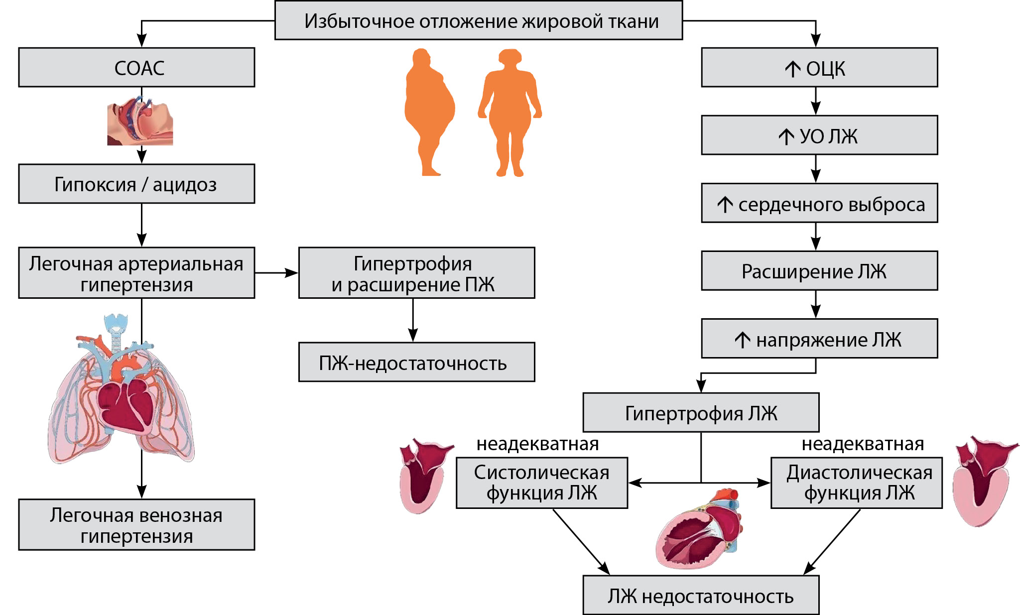 Примечания: ОЦК — объем циркулирующей крови; УО — ударный объем; ЛЖ — левый желудочек; ПЖ — правый желудочек; СОАС — синдром обструктивного апноэ сна.