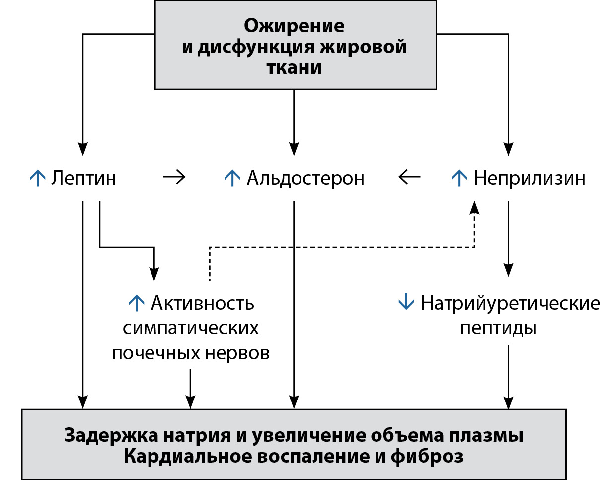 Рисунок 3. Ожирение и роль оси «лептин-альдостерон-неприлизин» в патогенезе хронической сердечной недостаточности (адаптировано по M. Packer [33]).