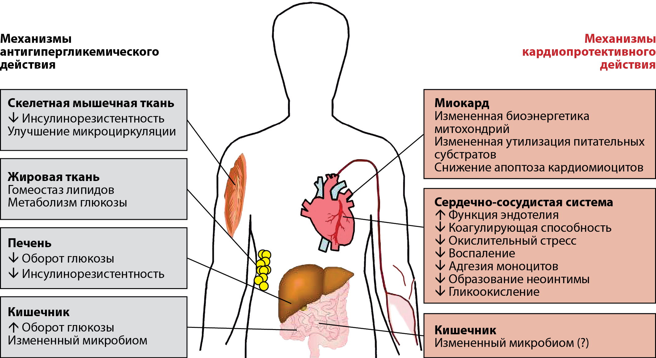 Рисунок 5. Механизмы антигипергликемического и кардиопротективного действия метформина (адаптировано по G. Schernthaner, et al. [49]).