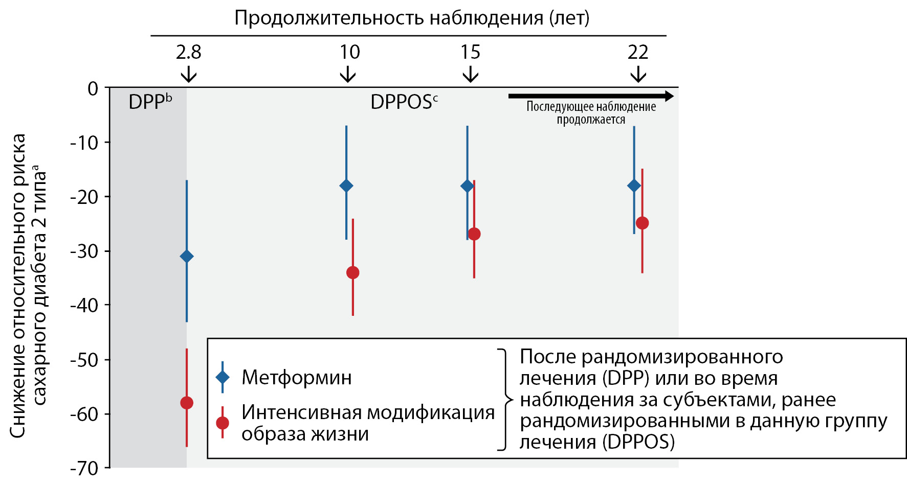 Отдельная важная глава в «послужном списке» метформина, касающемся начальных этапов диабетического континуума, представлена 3-летним исследованием Diabetes Prevention Program (DPP) и ставшим его продолжением Diabetes Prevention Program Outcomes Study (DPPOS) [71]. Участникам, получавшим метформин в протоколе DPP и имевшим показания для пролонгации лечения в соответствии с текущими рекомендациями, было предложено продолжить терапию в прежней дозе — 850 мг 2 раза в день (рис. 6) [72]. Терапия плацебо, ранее применяемая в DPP, была прекращена у пациентов исследования DPPOS. Все пациенты, как соблюдающие рекомендации «стандартной» модификации образа жизни, так и его «интенсивного» изменения, дополнительно прошли обучение по немедикаментозным мероприятиям профилактики СД2. Тем, кто ранее был рандомизирован в группу интенсивного поведенческого вмешательства, при пролонгации наблюдения метформин также не назначался и каждые 6 мес проводилась дополнительная поддержка изменения поведенческой стратегии в виде консультирования в клинике. В DPPOS были включены 88% пациентов популяции DPP: 589 человек из группы интенсивного поведенческого вмешательства, 599 пациентов из группы метформина, которые продолжили прием препарата, и 605 участников из группы плацебо, которым, соответственно, не инициировали прием бигуанида при отсроченном наблюдении [71].