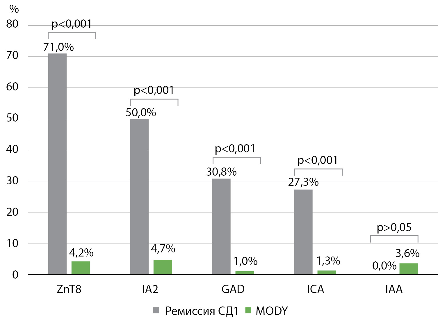 ЗАКЛЮЧЕНИЕ. Наибольшую значимость для проведения дифференциальной диагностики СД1 и MODY при длительном инсулиннезависимом периоде (более 6 мес) у детей с СД показали АТ ZnT8 и IA2. При отсутствии АТ рекомендовано проведение молекулярной диагностики. При выявлении только одного типа АТ решение о необходимости молекулярно-генетического анализа должно проводиться на основании комплексного анализа фенотипических характеристик пациента, включая данные наследственного анамнеза, особенности манифестации, показателей углеводного обмена.