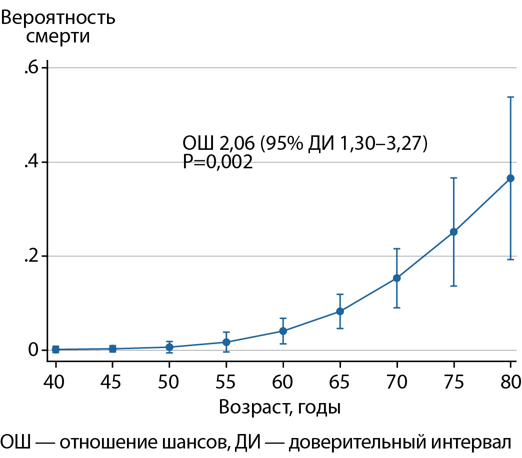 1. Рисунок 1. Результаты логистического регрессионного анализа: вероятность смерти в течение 5 лет в зависимости от возраста пациента.
