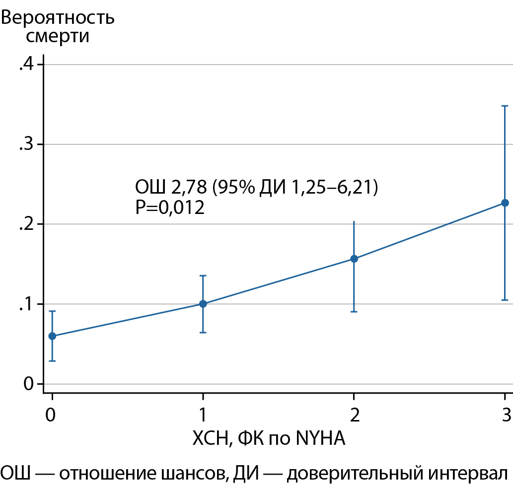 2. Рисунок 2. Результаты логистического регрессионного анализа: вероятность смерти в течение 5 лет в зависимости от функционального класса хронической сердечной недостаточности (по NYHA).