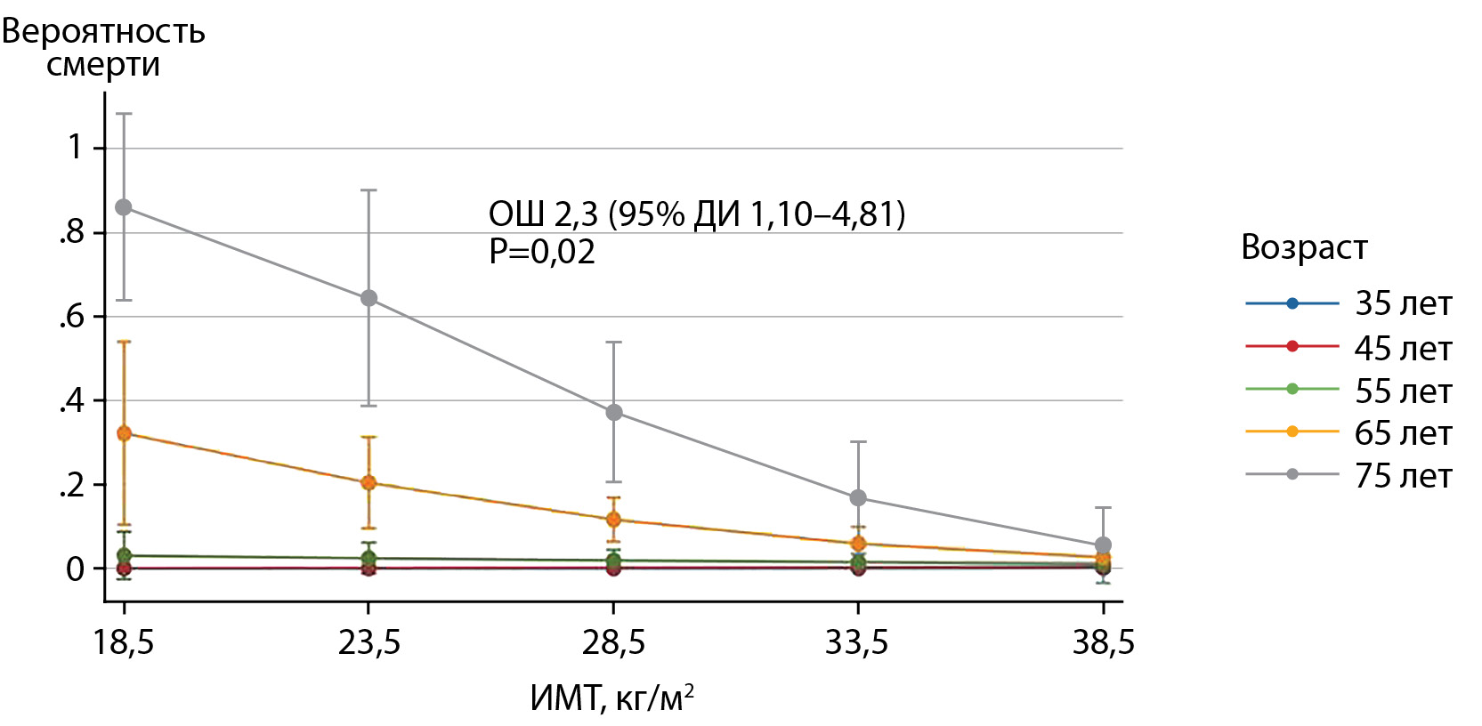 3. Рисунок 3. Результаты логистического регрессионного анализа: вероятность смерти в течение 5 лет в зависимости от взаимодействия индекса массы тела с возрастом.