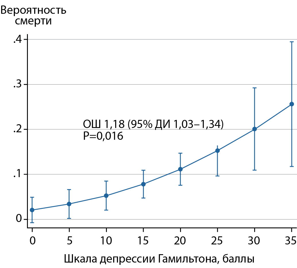 4. Рисунок 4. Результаты логистического регрессионного анализа: вероятность смерти в течение 5 лет в зависимости от балла депрессии по шкале Гамильтона.