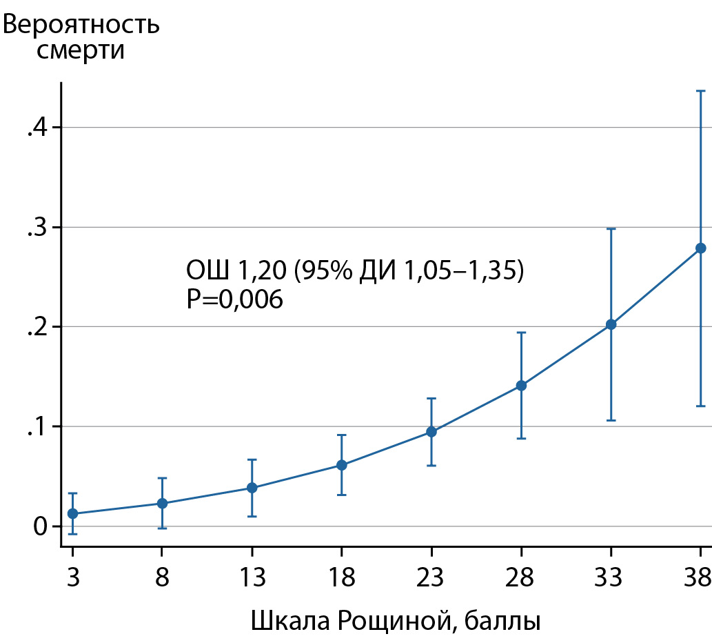 5. Рисунок 5. Результаты логистического регрессионного анализа: вероятность смерти в течение 5 лет в зависимости от балла когнитивной дисфункции по шкале Рощиной.