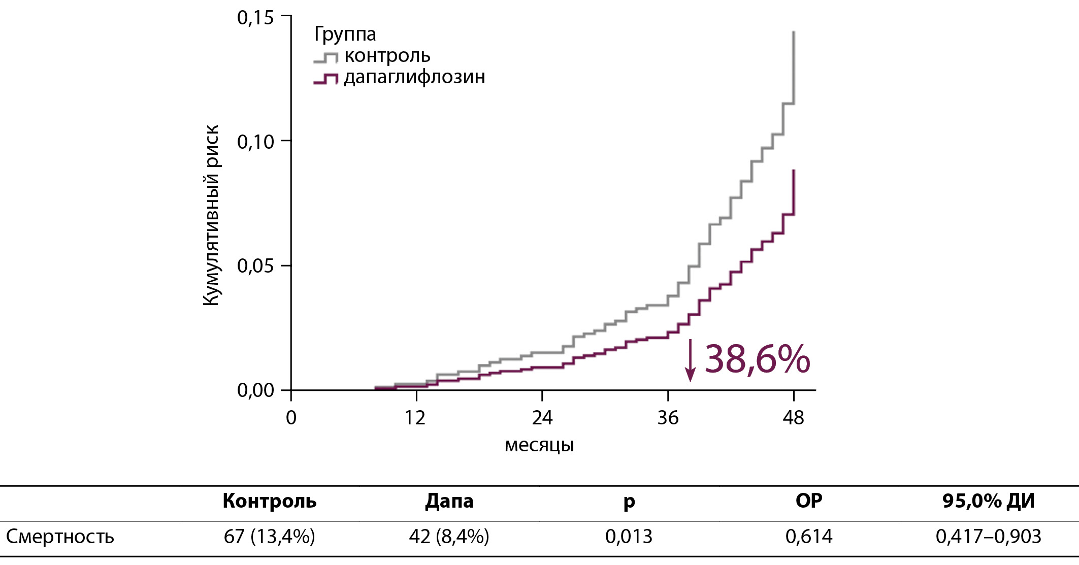 РЕЗУЛЬТАТЫ. На 1-м этапе работы был проведен анализ данных 499 пациентов, начавших лечение дапаглифлозином в 2017 г., а также 499 пациентов контрольной группы (n=998). Исходные характеристики пациентов в основном были сопоставимыми. Показатели систолического артериального давления и уровня НbА1с до исследования были хуже в группе дапаглифлозина. Применение дапаглифлозина ассоциировалось со снижением относительного риска (ОР) смерти от всех причин на 39% (ОР 0,614; 95% ДИ 0,417–0,903; р=0,013), приводило к снижению уровня НbА на 0,8% (с 8,5 до 7,7%, p<0,001) на протяжении 48 мес наблюдения.