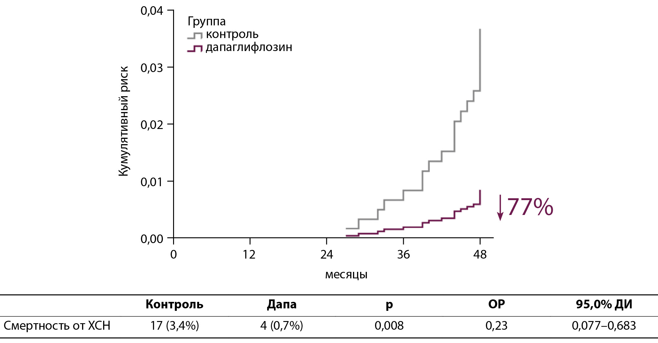 Эффективность дапаглифлозина в предотвращении сердечно-сосудистых событий подтверждается результатами исследования DECLARE-TIMI 58 [15], а также исследованием CVD-REAL Nordic [25]. Дапаглифлозин значимо снижал риск МАСЕ на22% (ОР 0,78; 95% ДИ 0,67–0,94), госпитализации по поводу ХСН на 38% (ОР 0,62; 95% ДИ 0,50–0,77) и смертности от всех причин на 41% (ОР 0,59; 95% ДИ 0,49–0,72) по сравнению с ингибиторами дипептидилпептидазы 4-го типа.