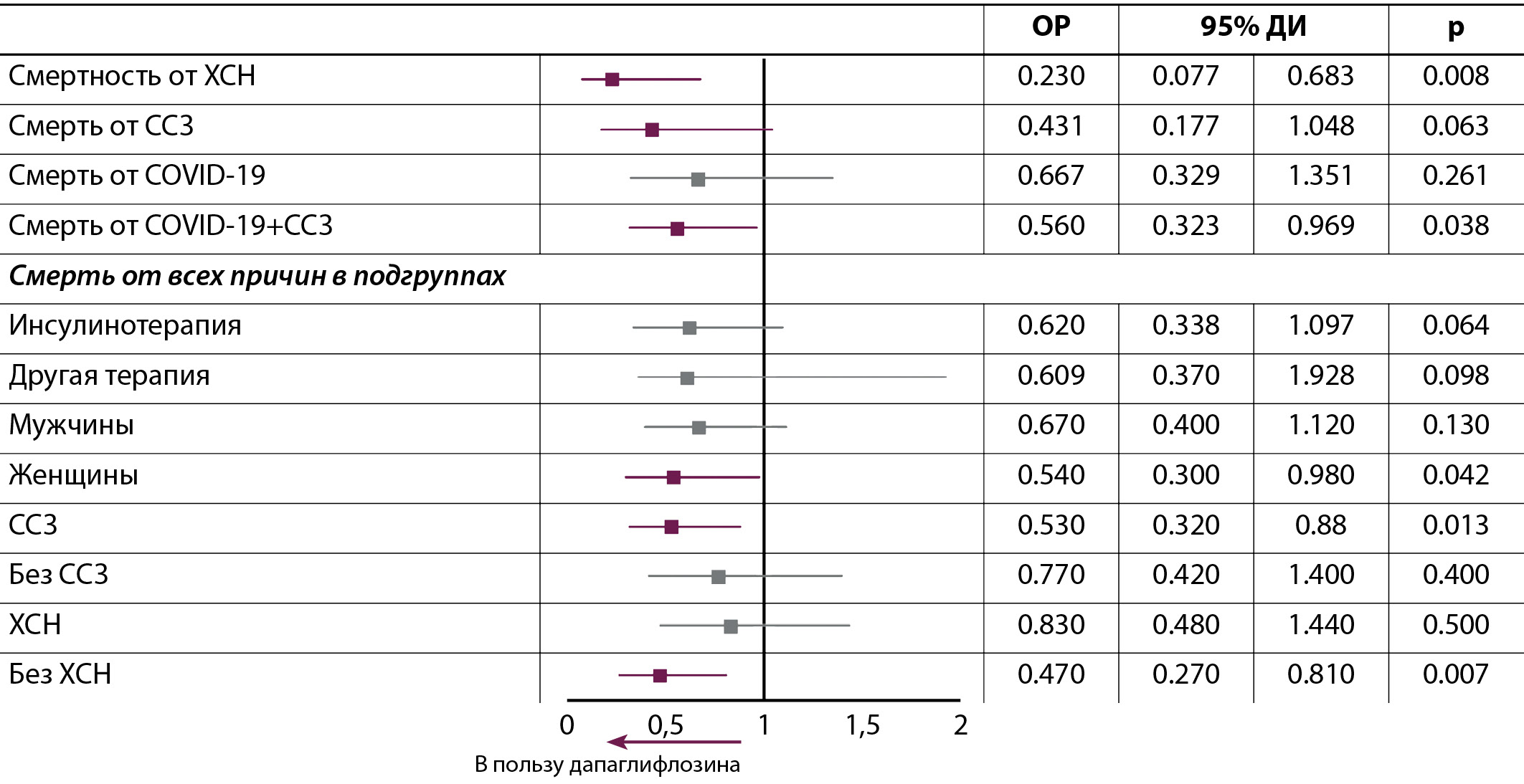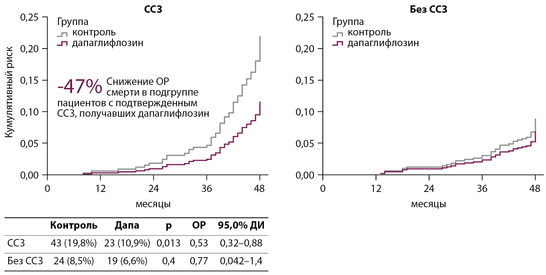Наличие или отсутствие подтвержденного ССЗ в анамнезе на момент включения пациента в анамнез являлось значимым фактором, оказывавшим влияние на выживаемость пациентов. В нашем исследовании пациенты с подтвержденным ССЗ также получали наибольшую пользу от терапии дапаглифлозином: риск смерти от всех причин снижался на 47% (рис. 8).