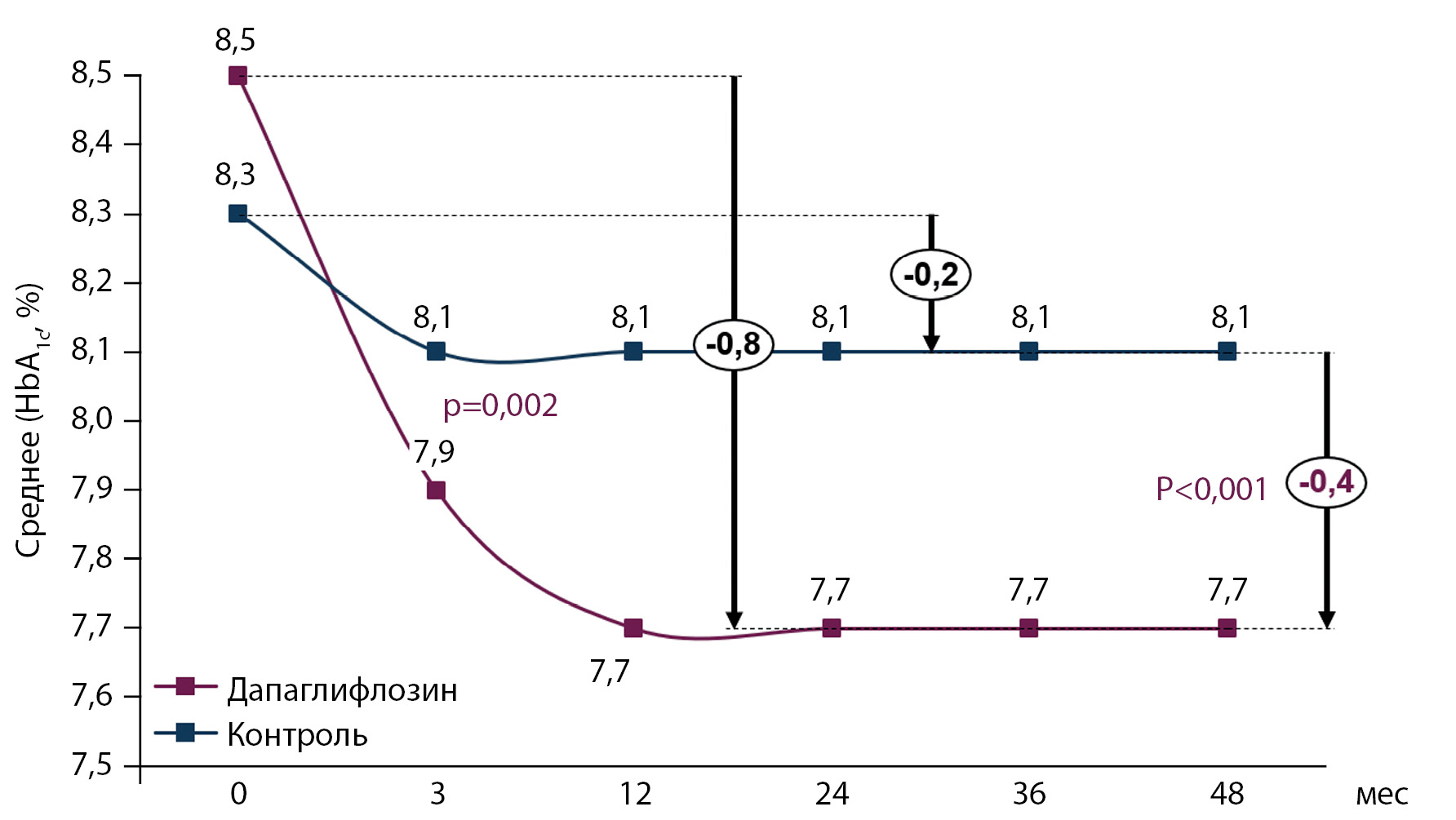 Исходные характеристики пациентов двух групп были сопоставимыми по основным показателям (табл. 1). По ряду характеристик между группами были выявлены статистически значимые различия (уровень НbА, уровень систолического АД, частота использования метформина). При этом показатели уровней АД и НbА в группе дапаглифлозина были хуже, чем в группе контроля. Метформин в группе дапаглифлозина использовался реже (табл. 1).