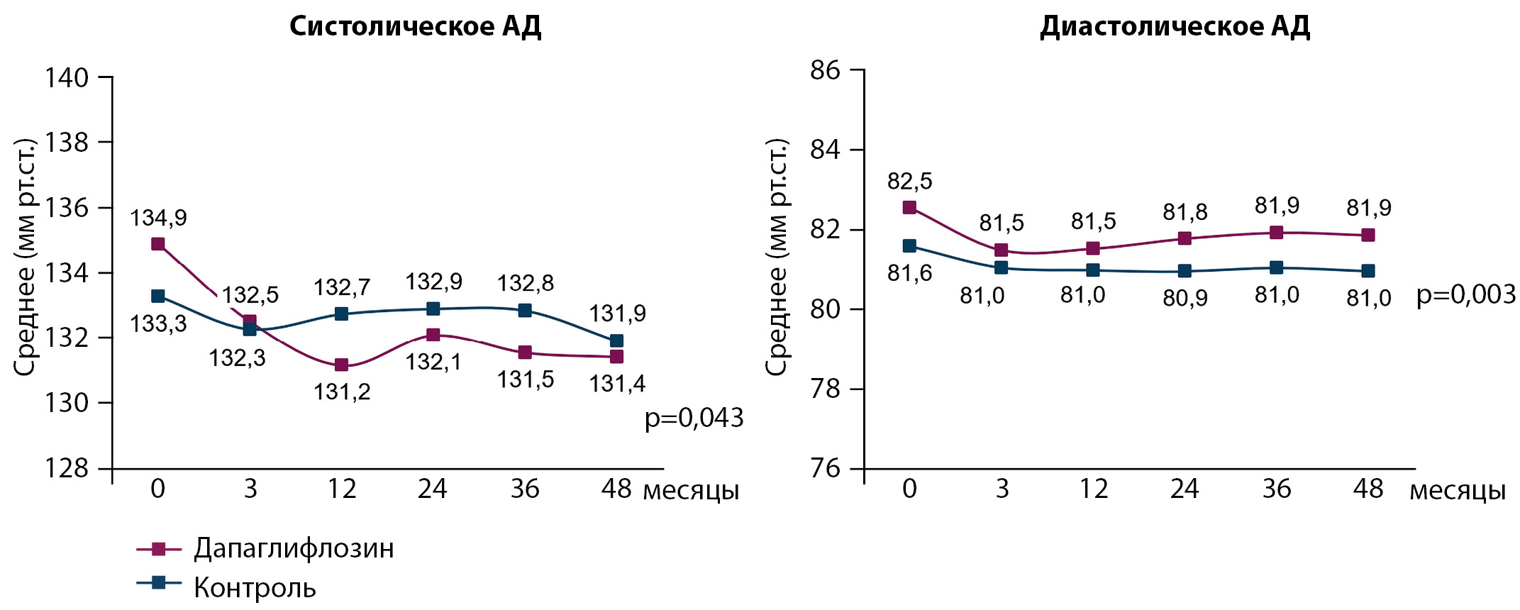 6. Рисунок 6. Динамика показателей артериального давления в группах за 48 месяцев наблюдения.