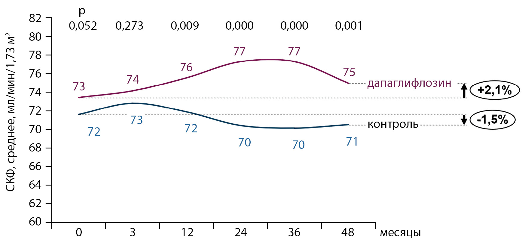 Кроме того, применение дапаглифлозина ассоциировалось с отсутствием снижения рСКФ при наблюдении в течение 48 мес по сравнению с контрольной группой. Влияние дапаглифлозина на почечные исходы ранее также оценивали в исследовании DECLARE-TIMI 58 [26]. Было продемонстрировано, что дапаглифлозин снижал вероятность прогрессирования почечной недостаточности, о чем свидетельствовала более низкая частота почечных комбинированных и дополнительных почечных конечных точек в группе дапаглифлозина по сравнению с плацебо. В то же время среднее снижение рСКФ по сравнению с исходным уровнем было значимо больше в группе дапаглифлозина, чем в группе плацебо, через 6 мес (p<0,0001), однако эти показатели в группах сравнялись через 2 года наблюдения, а через 3 и 4 года после рандомизации снижение рСКФ в группе плацебо превысило таковое в группе дапаглифлозина [27].