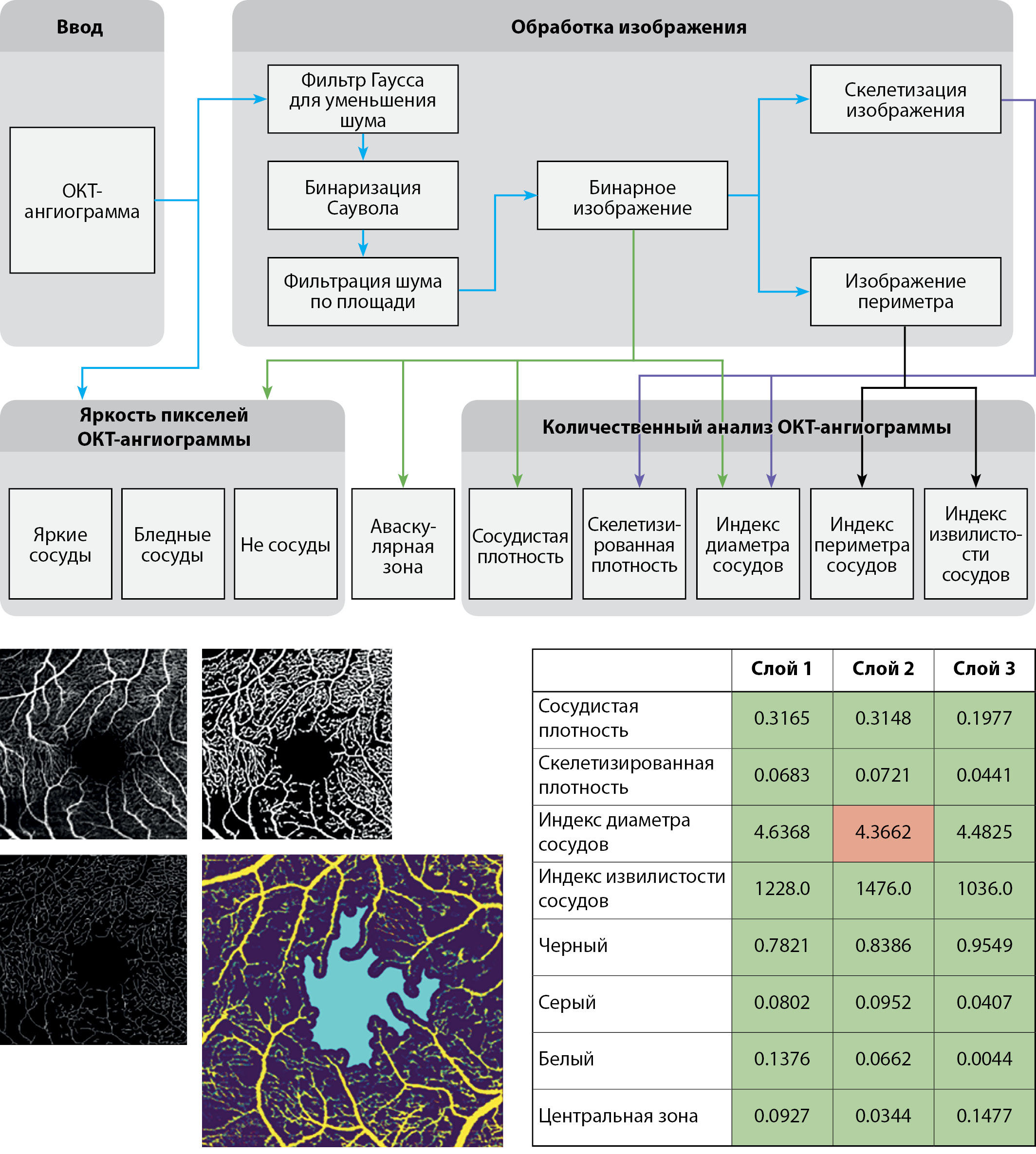 1. Рисунок 1. Алгоритмическая схема формирования признаков с последующим квантитативным анализом оптических когерентных томограмм-ангиограмм.