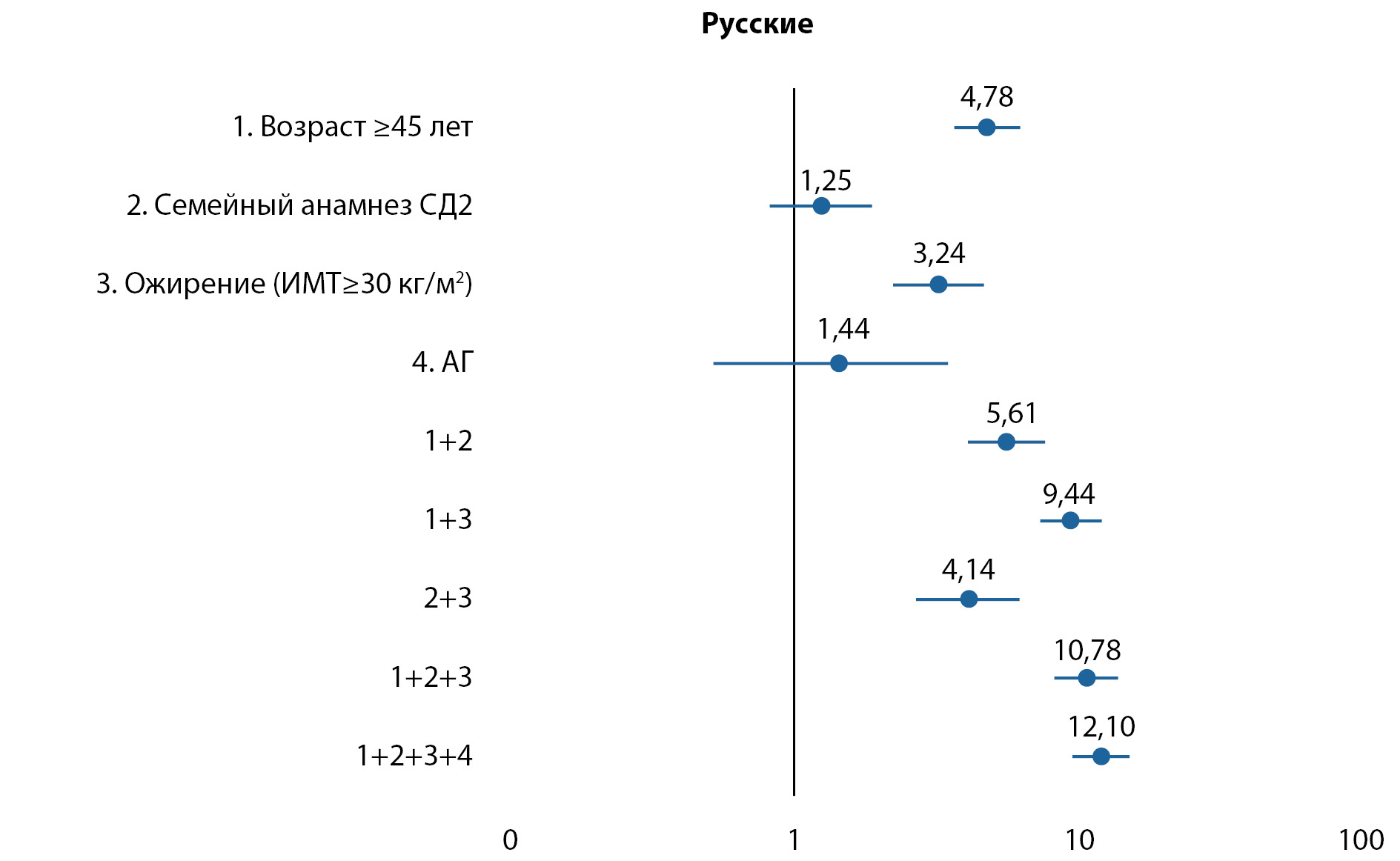 2. Приложение 3. Рисунок 1. Относительный риск развития нарушений углеводного обмена в группе «Русские ЦФО» в зависимости от факторов риска сахарного диабета 2 типа.
