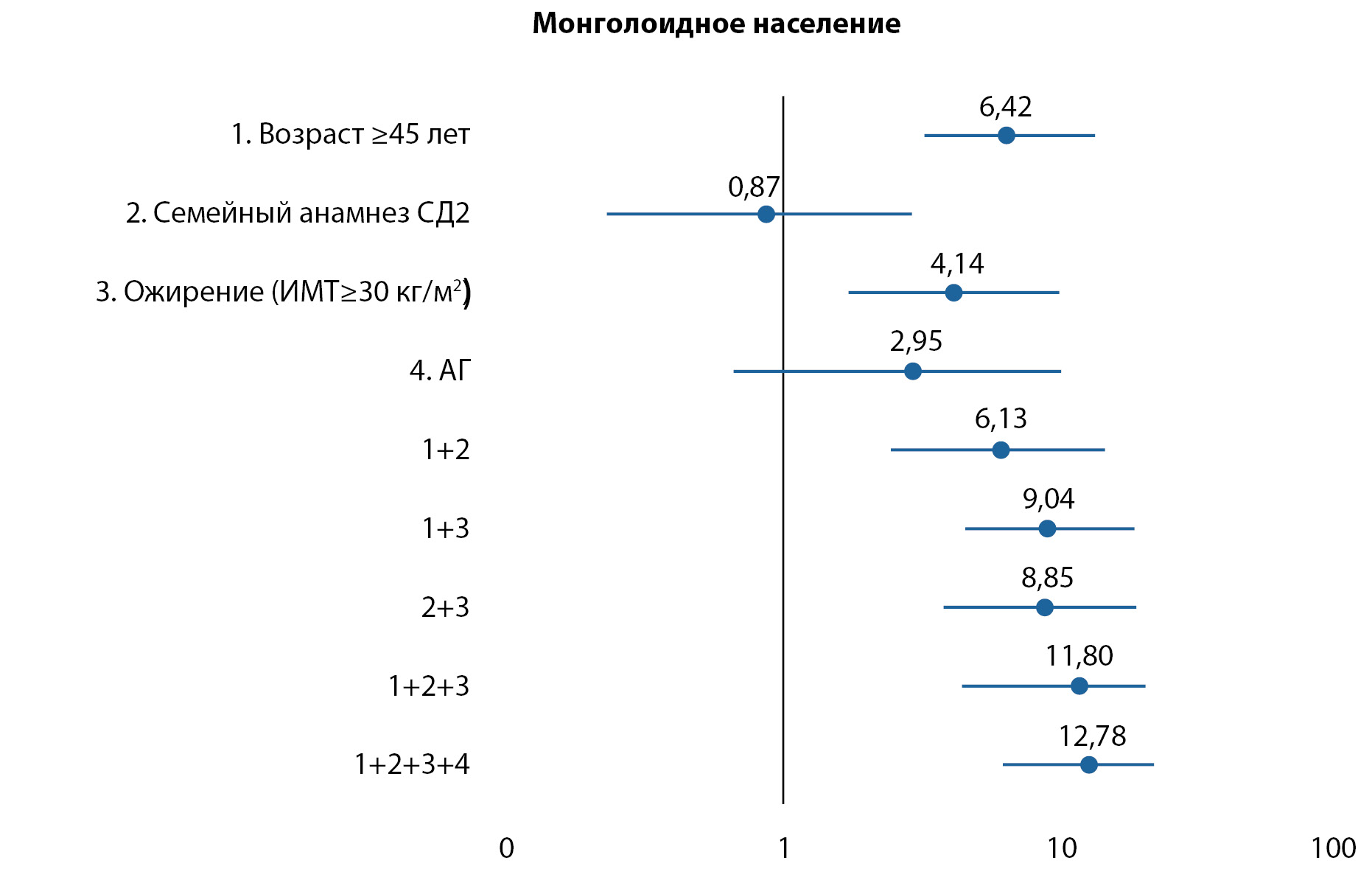 3. Приложение 3. Рисунок 2. Относительный риск развития нарушений углеводного обмена в группе «Монголоидное население» в зависимости от факторов риска сахарного диабета 2 типа.