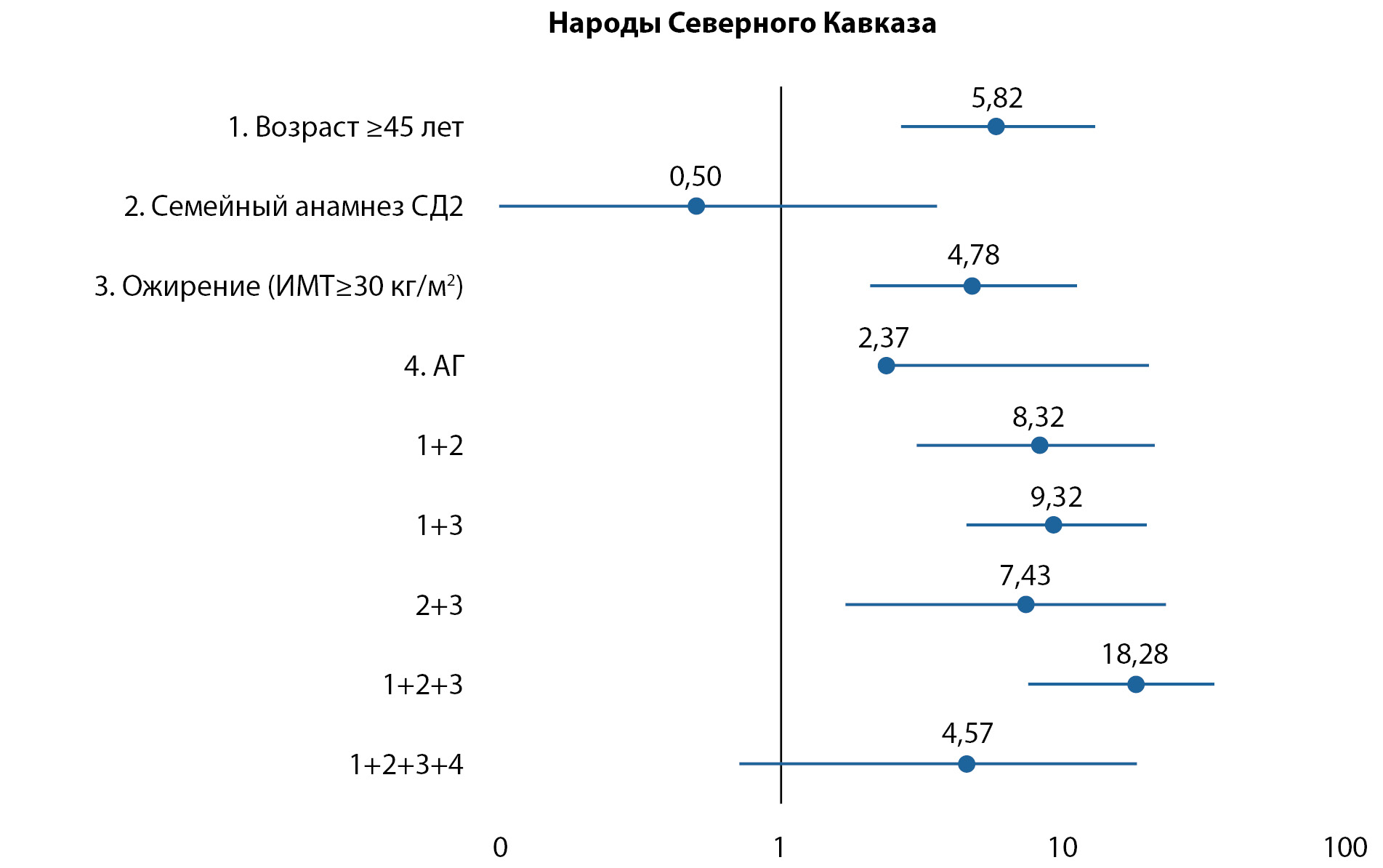4. Приложение 3. Рисунок 3. Относительный риск развития нарушений углеводного обмена в группе «Народы Северного Кавказа» в зависимости от факторов риска сахарного диабета 2 типа.