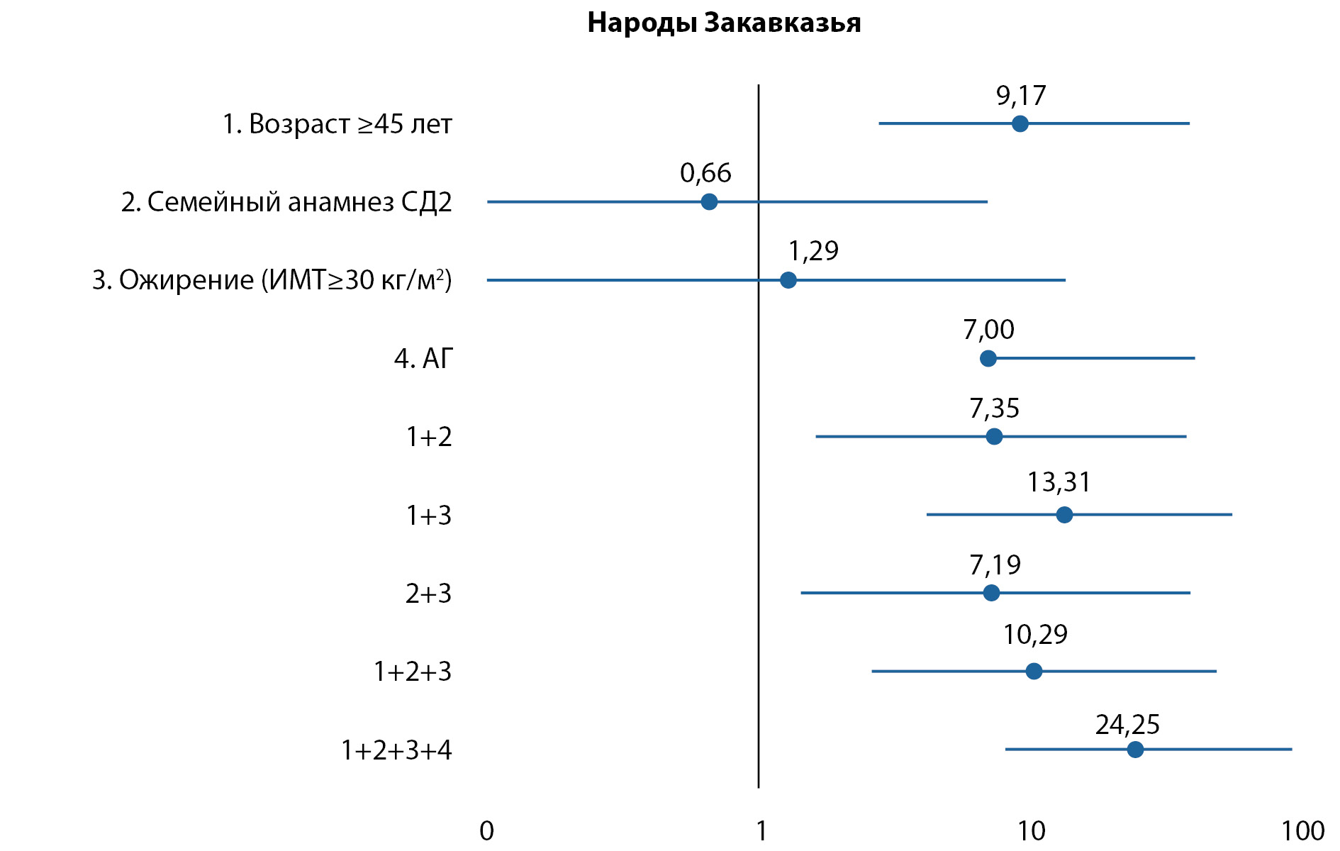 5. Приложение 3. Рисунок 4. Относительный риск развития нарушений углеводного обмена в группе «Народы Закавказья» в зависимости от факторов риска сахарного диабета 2 типа.