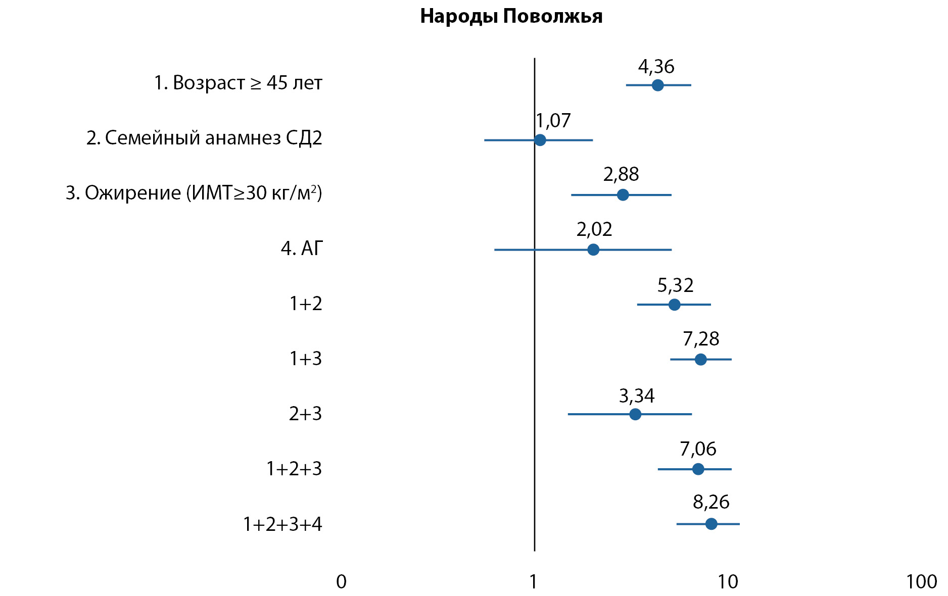 6. Приложение 3. Рисунок 5. Относительный риск развития нарушений углеводного обмена в группе «Народы Поволжья» в зависимости от факторов риска сахарного диабета 2 типа