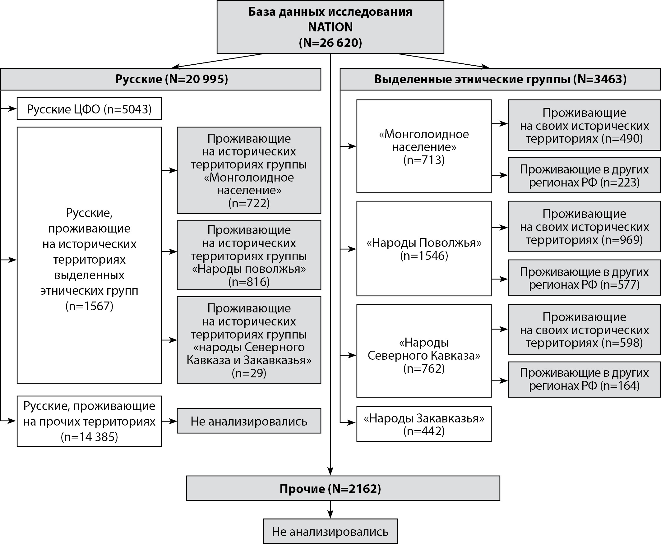 В настоящий анализ были включены данные участников исследования NATION, указавшие свою национальность при заполнении анкет. Учитывая многообразие этнического состава населения РФ, в ряде случаев пропущенные данные в графе «национальность», доминирующее количество русских, не удалось выделить моноэтнические группы удовлетворительной статистической мощности. В связи с чем в зависимости от самостоятельно указанной национальности на основании антропологических признаков были выделены следующие этнические группы: