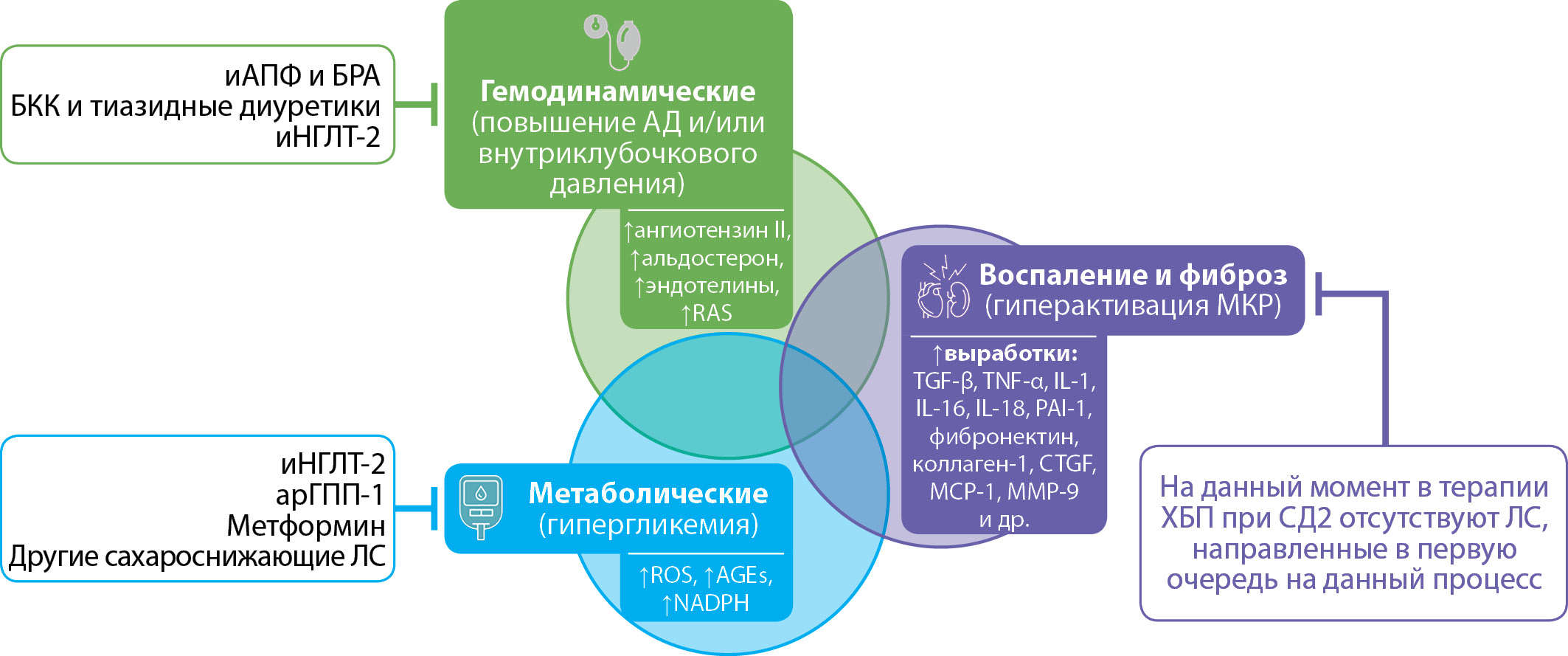 иАПФ — ингибиторы ангиотензин-превращающего фермента; БРА — блокаторы рецепторов ангиотензина II; БКК — блокаторы кальциевых каналов; иНГЛТ-2 — ингибиторы натрий-глюкозного котранспортера 2 типа; RAS — ренин-ангиотензин-альдостероновая система (РААС); арГПП-1 — агонисты рецепторов глюкагоноподобного пептида-1; ЛС — лекарственные средства; ROS — reactive oxygen species (активные формы кислорода); AGEs — конечные продукты гликирования; NADPH — nicotinamide adenine dinucleotide phosphate (никотинамидадениндинуклеотидфосфат); МКР — минералокортикоидные рецепторы; TGF-β — transforming growth factor β (трансформирующий фактор роста β); TNF-α — transforming growth factor α (Фактор некроза опухоли α); IL-1 — interleukin-1 (интерлейкин 1); IL-16 — interleukin-16 (интерлейкин 16); IL-18 — interleukin-18 (интерлейкин 18); PAI-1 — plasminogen activator inhibitor type 1 (ингибитор активатора плазминогена 1); CTGF — connective tissue growth factor (фактор роста соединительной ткани); MCP-1 — monocyte chemotactic protein 1 (моноцитарный хемотаксический фактор-1); MMP-9 — matrix metallopeptidase 9 (матриксная металлопротеиназа 9).