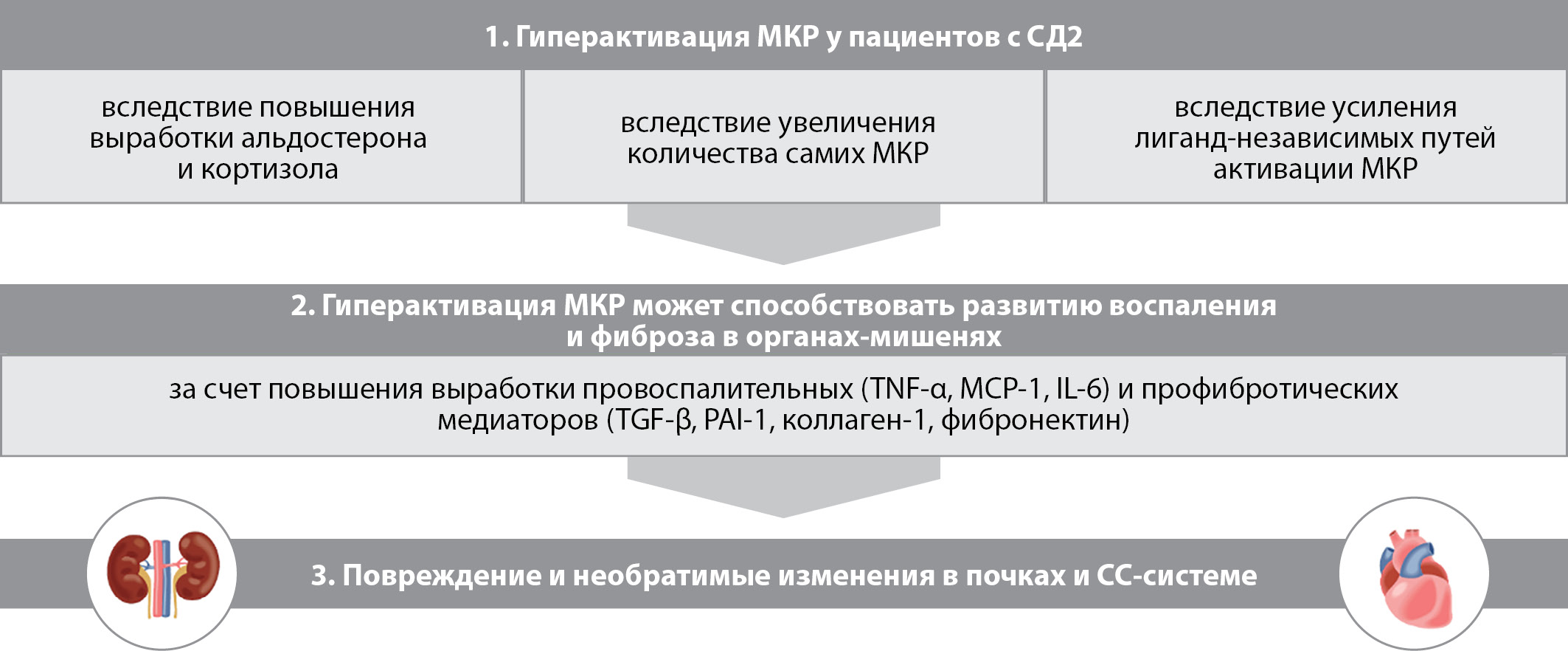 Эволюция понимания механизмов, лежащих в основе развития и прогрессирования ХБП на фоне СД2, определяет необходимость реализации многофакторной терапевтической стратегии [3][11]. У пациентов с ХБП и СД2 в качестве основных драйверов развития и прогрессирования ХБП выступают три группы факторов: гемодинамические, метаболические, а также факторы воспаления и фиброза. Современная терапия направлена преимущественно на контроль первых двух групп факторов, а причины, приводящие к повышению синтеза медиаторов воспаления и фиброза, до сих пор остаются вне основного терапевтического воздействия [25][33]. Гиперактивация МКР рассматривается в качестве одного из факторов повреждения органов-мишеней у пациентов с СД2 за счет потенцирования воспаления и фиброза [25][35]. В свете этого целесообразными видятся поиск и внедрение в практику лекарственных препаратов, нацеленных на блокирование МКР и обладающих кардионефропротективным эффектом у пациентов с ХБП и СД2. Только объединяя терапевтические стратегии по контролю всех патофизиологических факторов, появляется возможность максимально эффективно влиять на долгосрочный прогноз у пациентов с ХБП и СД2.