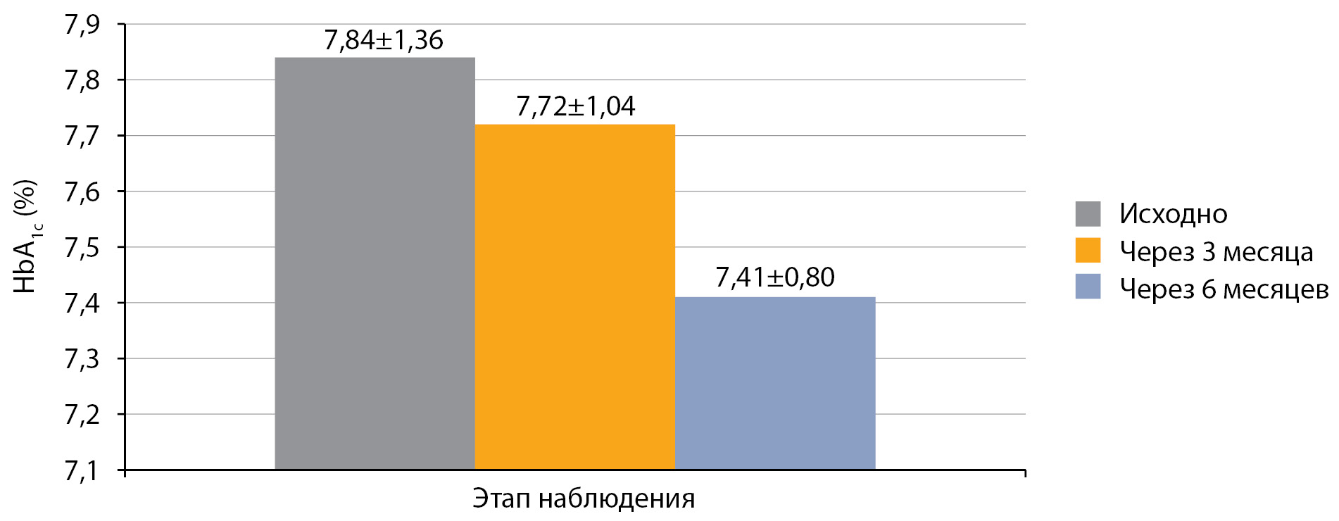 Средний уровень HbA1c у детей с СД1, получавших оригинальный аналог инсулина аспарт, перед переводом на РинФаст®, составил 7,84±1,36%. Через 3 месяца после перевода на РинФаст® средний уровень HbA1c у детей с СД1 составил 7,72±1,04% (р>0,05 в сравнении с исходным), а через 6 месяцев — 7,41±0,80% (р>0,05 в сравнении с исходным и через 3 месяца; рис. 1).