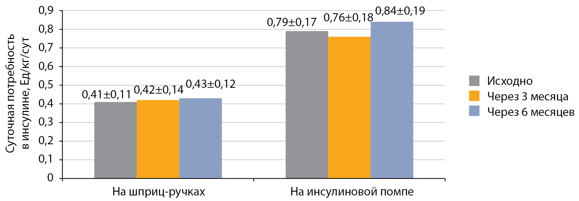 4. Рисунок 4. Динамика суточной потребности в инсулине после перевода на РинФаст® у детей с сахарным диабетом 1 типа (Ед/кг/сут; M±SD). | |