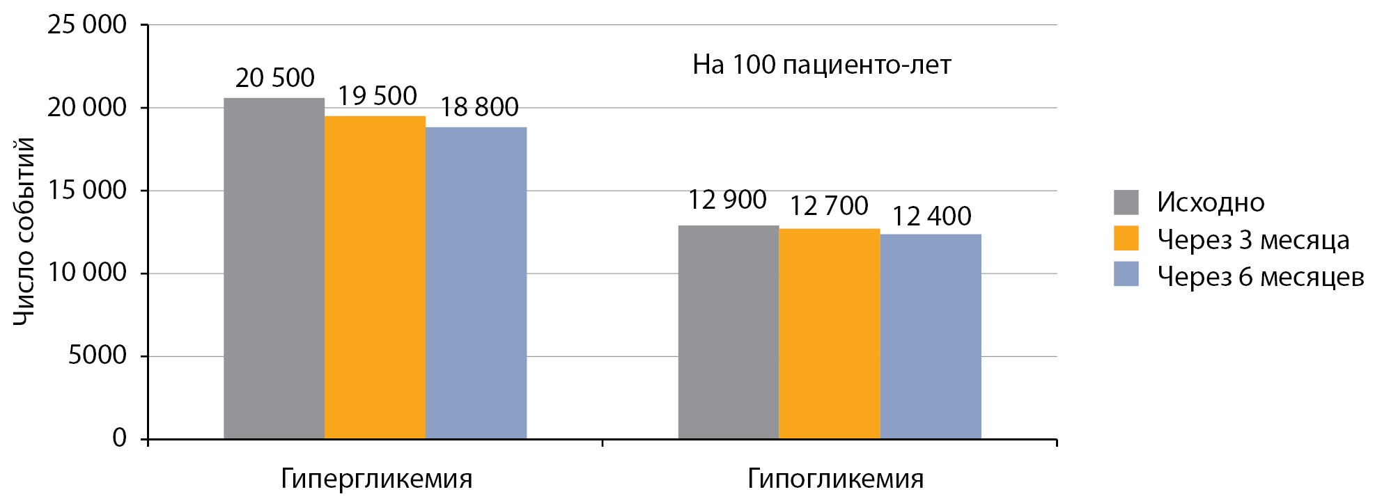 Оценка данных самоконтроля гликемии не определила значимого изменения количества гипер- и гипогликемий, не удовлетворяющих целевые показатели гликемии (более 10,0 ммоль/л и менее 3,9 ммоль/л) через 3 и через 6 месяцев (p>0,05 в обоих случаях; рис. 5).