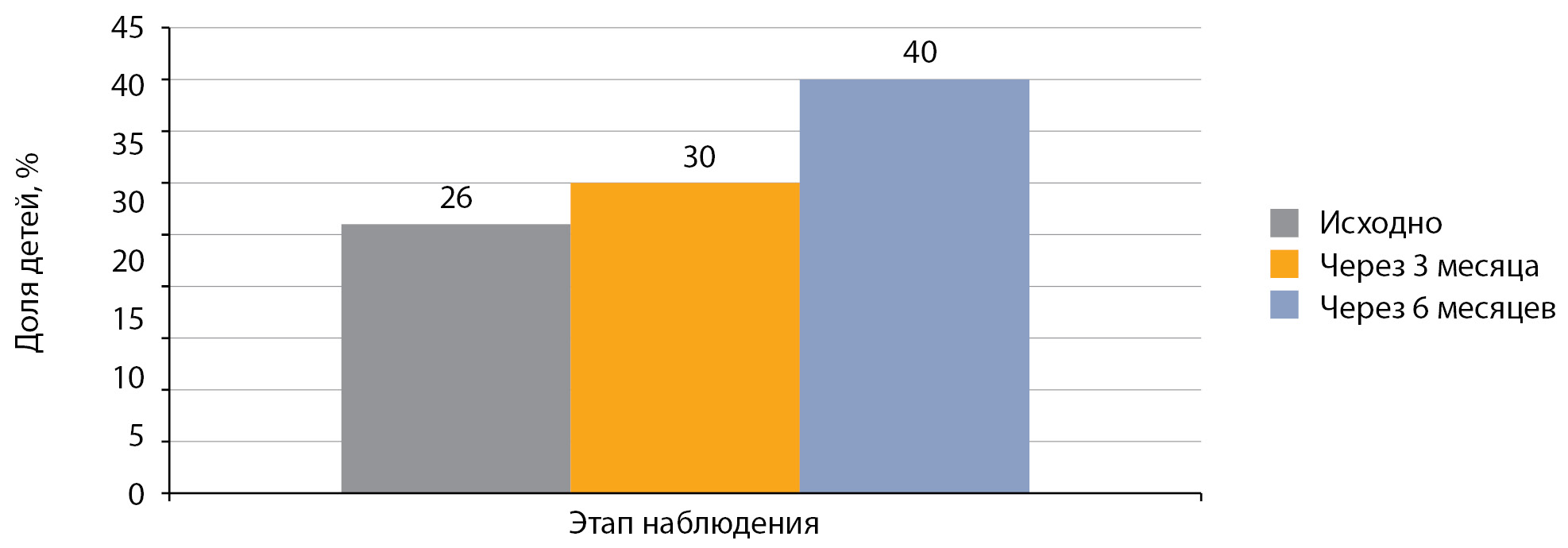 Доля детей с СД1, имевших целевой уровень HbA1c (<7,0%), исходно составляла 26,0%. Через 3 месяца после начала использования инсулина РинФаст® эта доля детей составила 30,0%. К концу клинического исследования (через 6 месяцев) она составила 40,0% (рис. 6), что объясняется проведением повторного обучения в школе самоконтроля СД1 перед переводом на инсулин РинФаст® и началом использования в 2022 г. системы непрерывного мониторинга глюкозы.