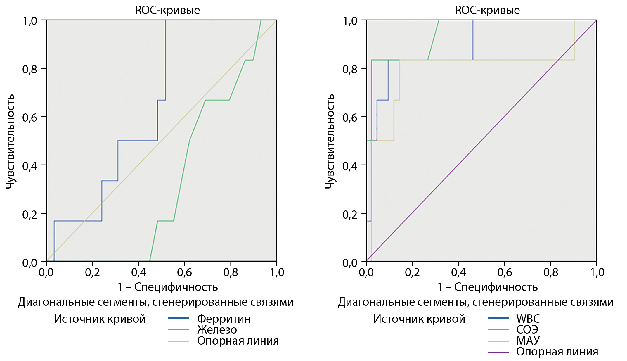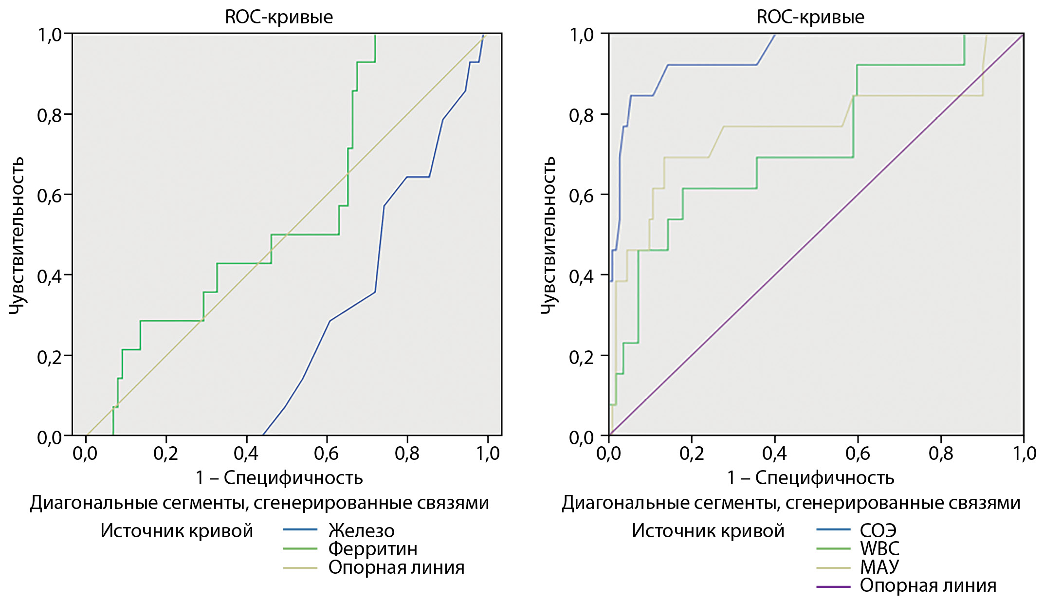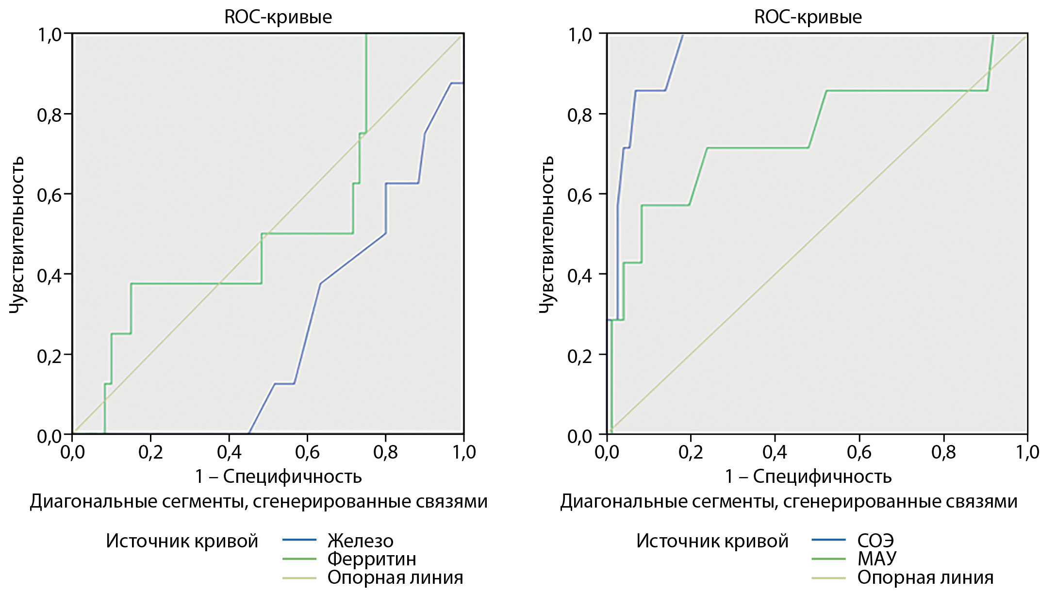 В общей выборке пациентов с СД (n=131) классический диагностический маркер АХЗ, ферритин, имел высокую чувствительность 93%, но низкую специфичность 34% при диагностическом пороге 38,4 нг/мл (площадь под кривой 0,574; р=0,375), без статистически достигнутой значимости результата. Содержание железа также было расценено как низкоинформативный параметр диагностики АХЗ: чувствительность 64%, специфичность 21% при диагностическом пороге 8,5 мкмоль/л (площадь под кривой 0,265; р=0,004) (рис. 1).