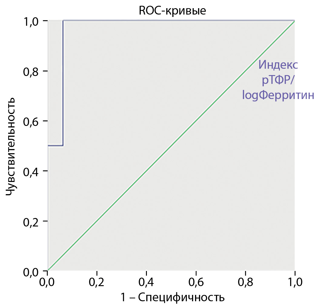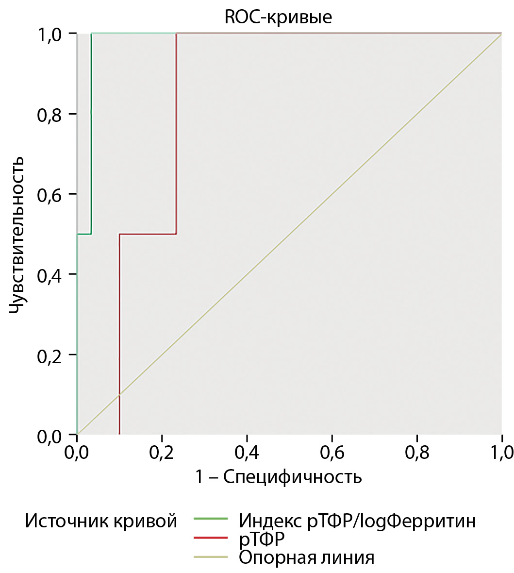 Поскольку наличие истинного дефицита железа оказывает влияние на оба вышеупомянутых параметра — концентрацию рТФР и содержание ферритина — в качестве еще одного маркера истощения запасов железа, уровень которого не меняется в условиях воспаления, нами был оценен индекс рТФР/logФерритин. Повышение данного индекса свидетельствует о дефиците железа или сочетании истинного дефицита железа и АХЗ. Существующие алгоритмы диагностики анемии не предлагают конкретных отрезных значений индекса рТФР/logФерритин для установления вида анемии, а в представленных в литературе работах эти пороговые значения, как и в случае с рТФР, разнородны. Большинство исследователей ориентируются на значение индекса, равное или превышающее 2,0, что говорит о дефиците железа, в том числе на фоне АХЗ, тогда как отношение рТФР/logФерритин менее 1,0 свидетельствует об изолированной АХЗ [40][41]. Есть работы, авторы которых предлагают в качестве «отрезного» значения для диагностики ЖДА использовать более низкое значение индекса рТФР/logФерритин, равное 1,5 [42].