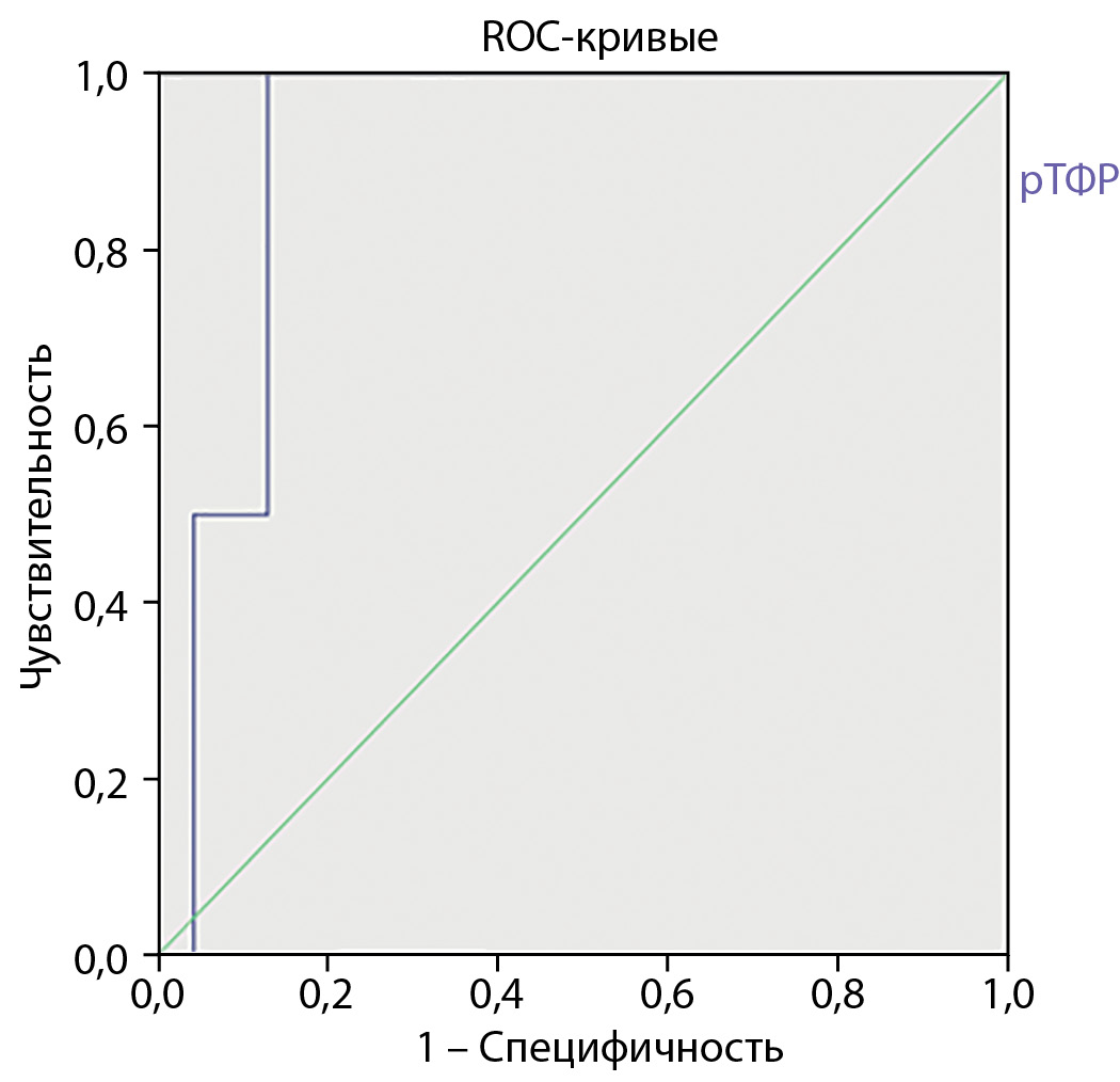 При СД2 чувствительность исследования рТФР составила 100%, специфичность — 87% при диагностическом пороге 1,47 нг/мл (площадь под кривой 0,913; р=0,047) (рис. 6). Оценка индекса рТФР/logФерритин при СД2 оказалась неинформативна.