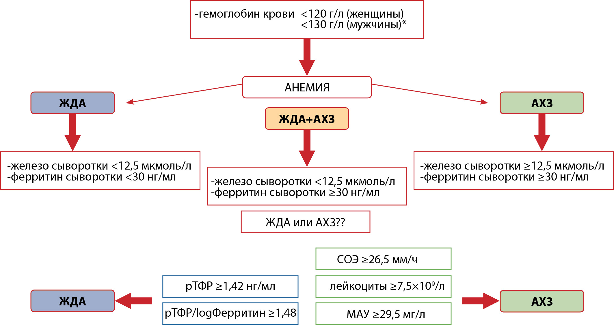 Таким образом, при СД одновременно существуют факторы, способствующие формированию как истинного дефицита железа с развитием ЖДА, так и иммуновоспалительные процессы, влияющие на эритропоэз и приводящие к развитию АХЗ [18]. Поскольку подходы к лечению этих двух видов анемии принципиально различаются, вопрос дифференциальной диагностики между ЖДА и анемией воспаления, а также случаев их сочетания является актуальным. При этом в настоящее время не разработано клинических рекомендаций по диагностике и лечению нарушений обмена железа у пациентов с СД, не представлен алгоритм дифференциальной диагностики анемического синдрома для данной когорты больных.