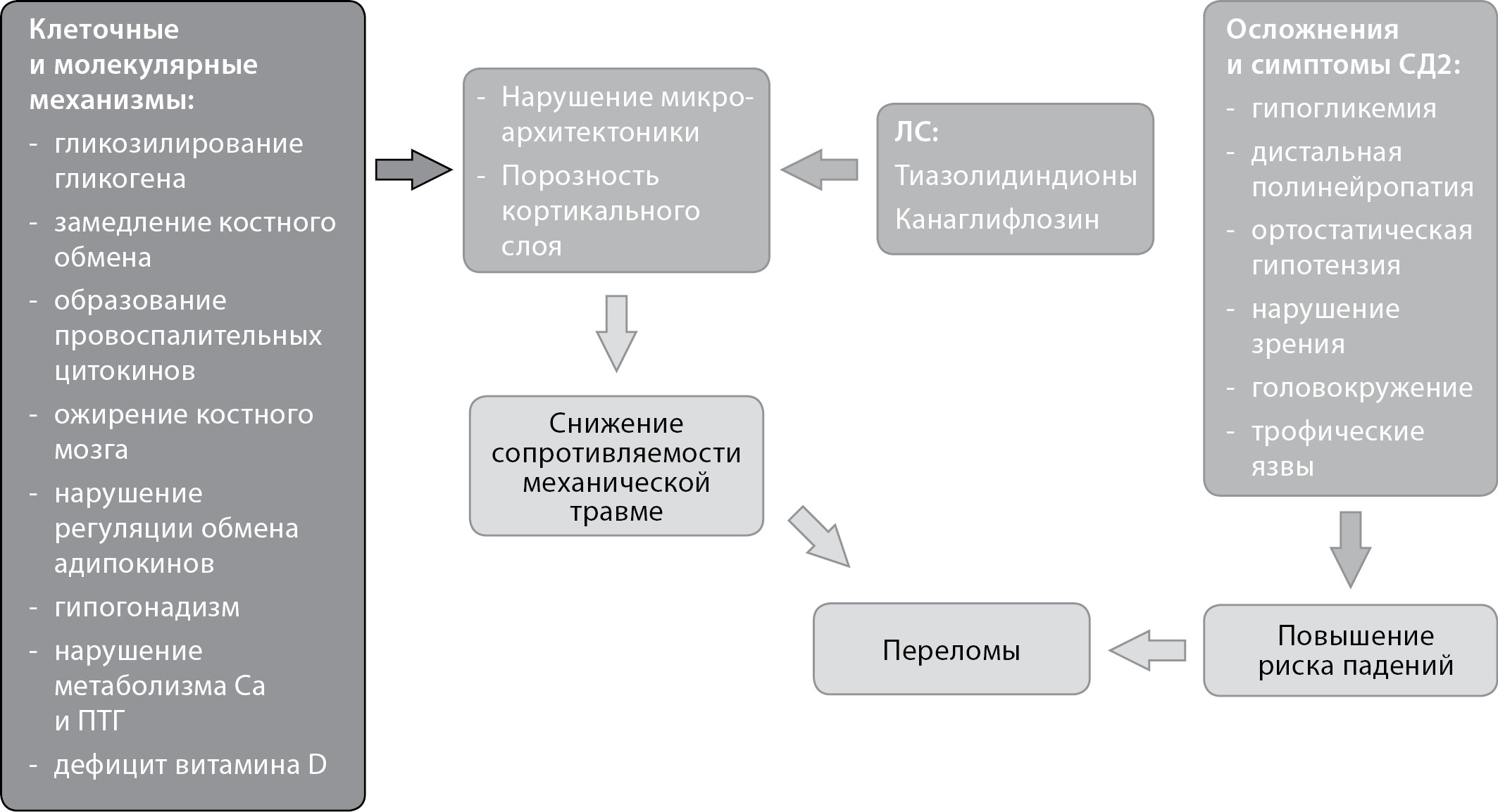 1. Рисунок 1. Возможные причины повышения риска переломов при СД2 (адаптировано из N. Napoli и соавт. [64]).