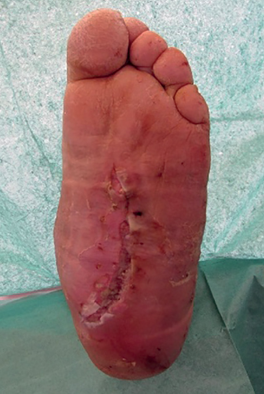 В нашей работе хронические раневые дефекты оперированной стопы отмечались у 25 пациентов (52%, 95% ДИ 37–67). Можно предположить, что такая частота язв связана с отсутствием фиксации костей стопы во время проведения хирургического вмешательства. Это могло привести к медленному, но неуклонному проседанию костных структур и дальнейшему развитию деформации стопы, и провоцировать формирование язвенного дефекта стопы.