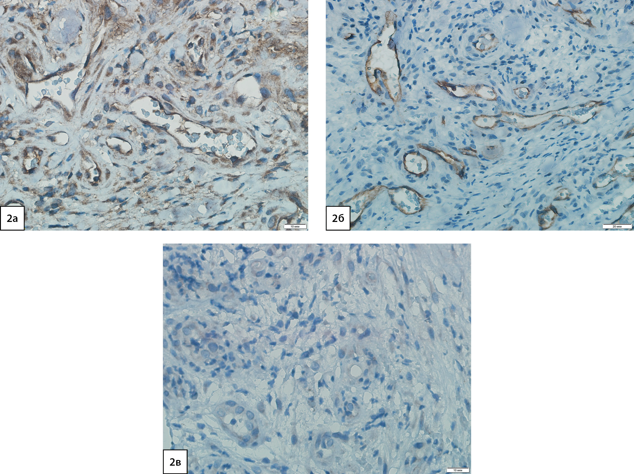 2. Рисунок 2. Микропрепараты экспрессии сосудистого эндотелиального фактора роста (СЭФР) в ранах разной длительности (окраска гематоксилином и эозином; экспрессированные клетки окрашены в коричневый цвет). 2а. Экспрессия СЭФР в ранах длительностью <90 дней. 2б. Экспрессия СЭФР в ранах длительностью от 90 до 365 дней. 2в. Экспрессия СЭФР в ранах с длительностью существования >365 дней. | |