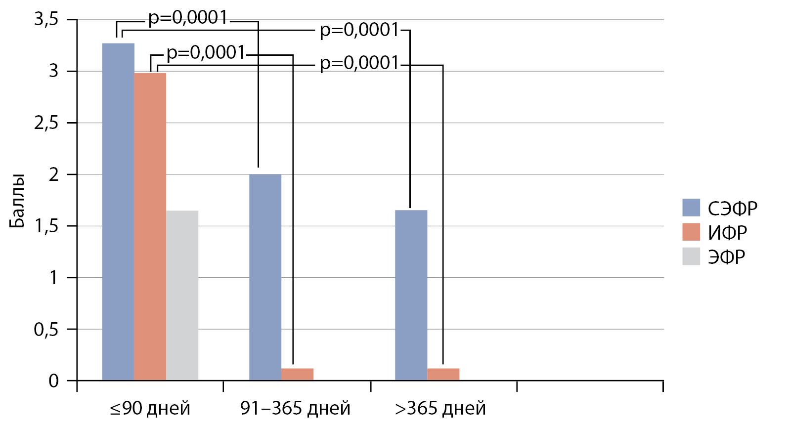 Таким образом, по данным представленным в табл. 4 и рис. 1, в образцах ран, длительность существования которых не превышала 90 дней, экспрессия ФР и рецепторов к ним была значимо выше, чем в ранах большей длительности. Значимой разницы в количественных показателях экспрессии ФР и рецепторов к ним между ранами длительностью 91–365 дней и >365 дней не получено.