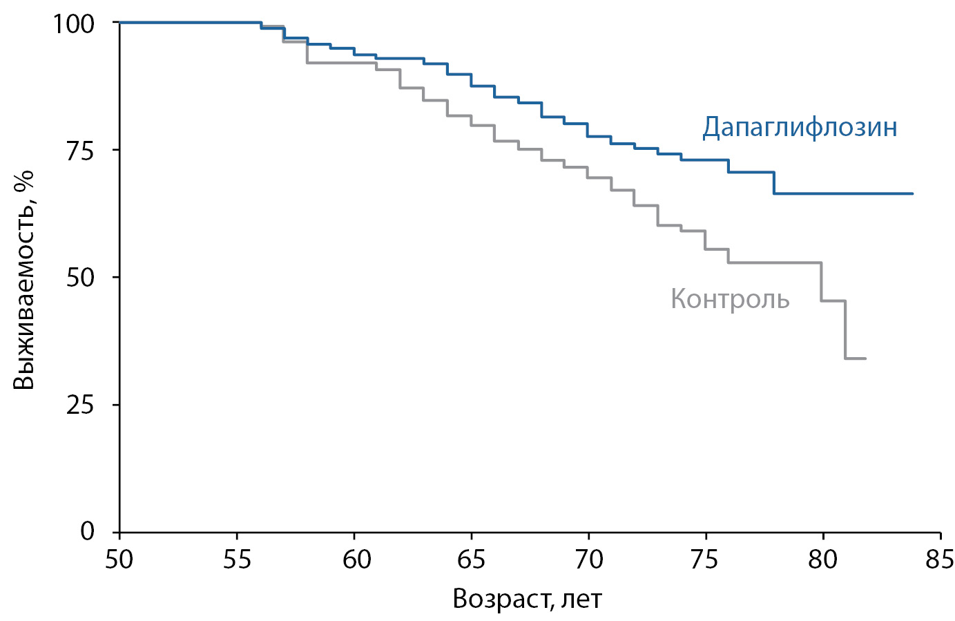 Прогнозируемая выживаемость до возраста 85 лет отражена на рис. 1. Существенное расхождение кривых выживаемости Каплана–Мейера наблюдали с 62 лет. Оценка кривых выживаемости указывала на значительно лучшие показатели общей выживаемости для пациентов, получавших дапаглифлозин, с наиболее выраженными различиями после достижения возраста 80 лет.