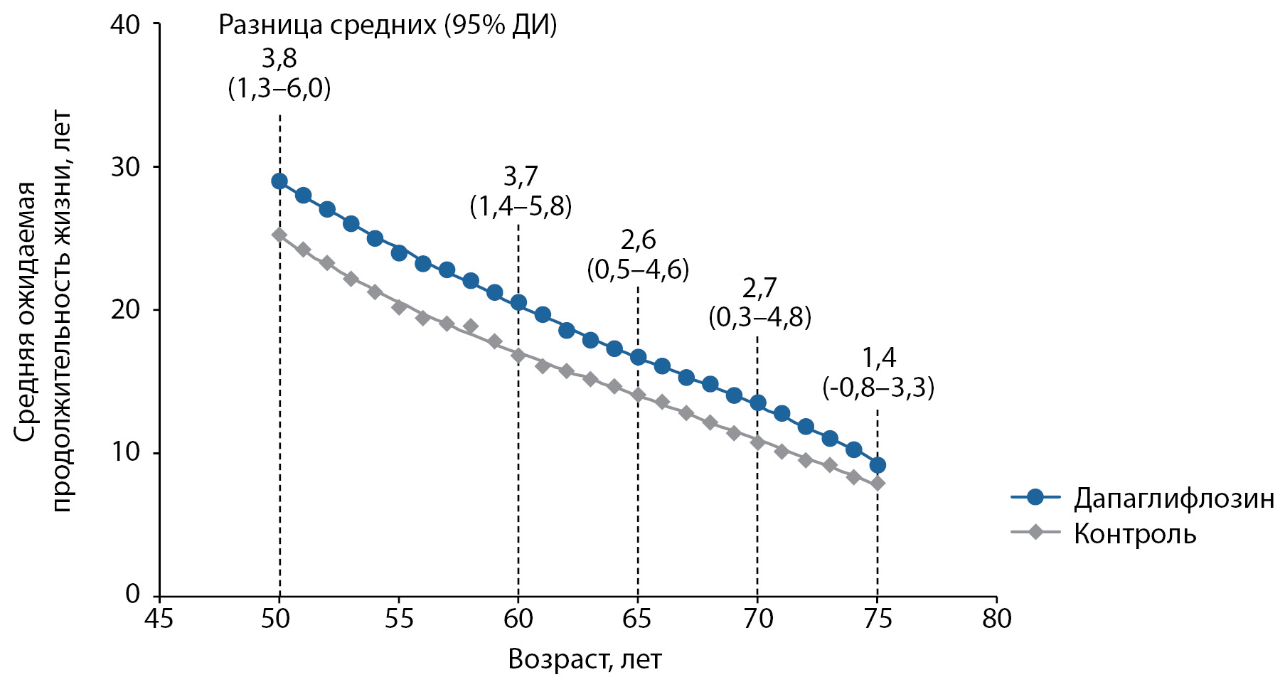 С возрастом наблюдали снижение разницы в ожидаемой продолжительности жизни между группами пациентов. Так, для возраста включения 60 лет ожидаемая продолжительность жизни составила 20,5 лет на терапии дапаглифлозином и 16,8 лет для пациентов из контрольной группы: разница 3,7 лет (95% ДИ 1,4 до 5,8). Для пациентов в возрасте 70 лет ожидаемая продолжительность жизни составила 13,5 и 10,8 лет соответственно, разница 2,7 лет (95% ДИ от 0,3 до 4,8). Для возраста 75 лет прогноз продолжительности жизни соответствовал 9,2 и 7,9 лет, средняя разница 1,4 года (95% ДИ от -0,8 до 3,3) (рис. 2).