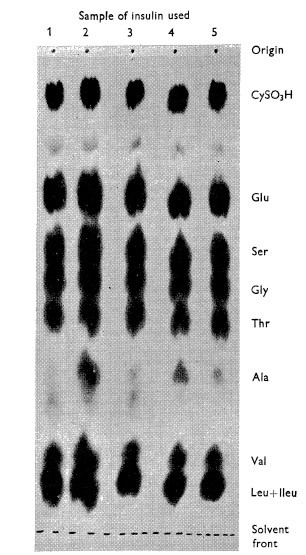 Рисунок 5. Бумажная хроматограмма образца инсулина из одного из экспериментов Сэнгера.