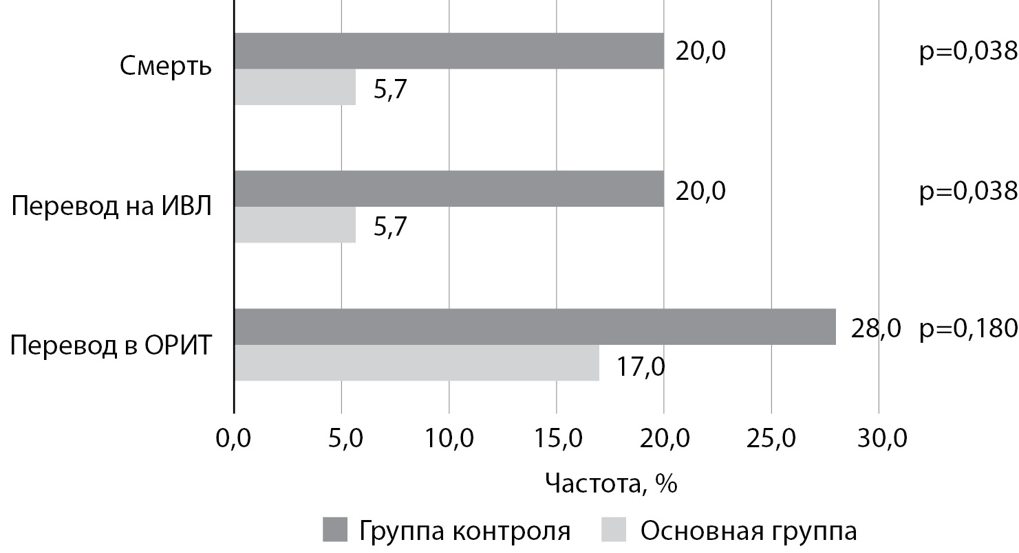 В основной группе 17,0% пациентов были переведены в ОРИТ, в группе контроля — 28% (p=0,18). Все пациенты, переведенные на ИВЛ, заканчивали летальным исходом: у больных, получающих дулаглутид, — 5,7%, в контрольной группе — 20,0%, смертность в контрольной группе была в 3,5 раза выше по сравнению с основной (р=0,038) (рис. 5). Не выявлено различий длительности госпитализации (10 койко-дней в основной группе vs 11 койко-дней в группе контроля, p=0,258).