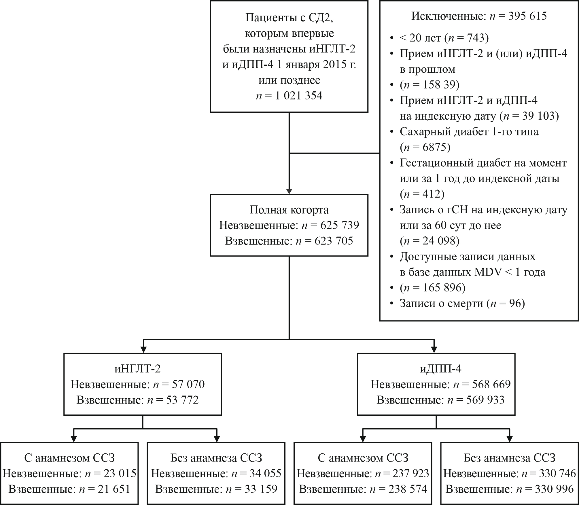 В исследование были включены 625 739 пациентов с СД2, которые соответствовали критериям отбора в течение периода исследования и не имели записей после смерти (рис. 1). Из них 57 070 пациентов (9,1%) впервые получали иНГЛТ-2, а 568 669 пациентов (90,9%) — иДПП-4. Среди принимавших иНГЛТ-2 23 015 пациентов (40,3%) имели ССЗ в анамнезе, а 34 055 пациентов (59,7%) — нет. Среди принимавших иДПП-4 237 923 пациента (41,8%) имели ССЗ в анамнезе, а 330 746 (58,2%) — нет. После корректировки с обратным взвешиванием вероятностей полная когорта включала 623 705 пациентов: 53 772 впервые начали принимать иНГЛТ-2 (с ССЗ в анамнезе: n=21 651; без ССЗ в анамнезе: n=33 159) и 569 933 впервые начали прием иДПП-4 (с ССЗ в анамнезе: n=238 574; без ССЗ в анамнезе: n=330 996).