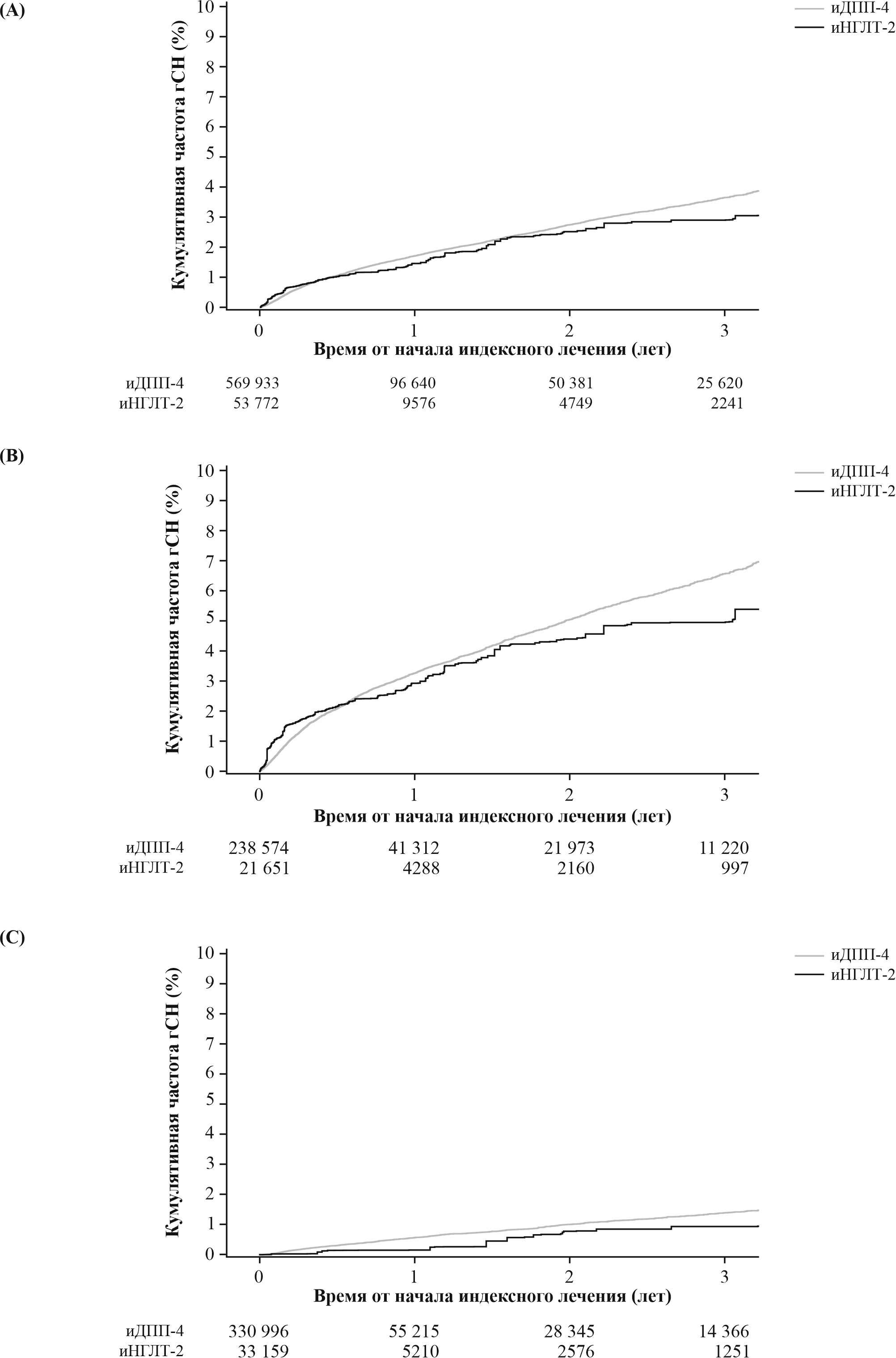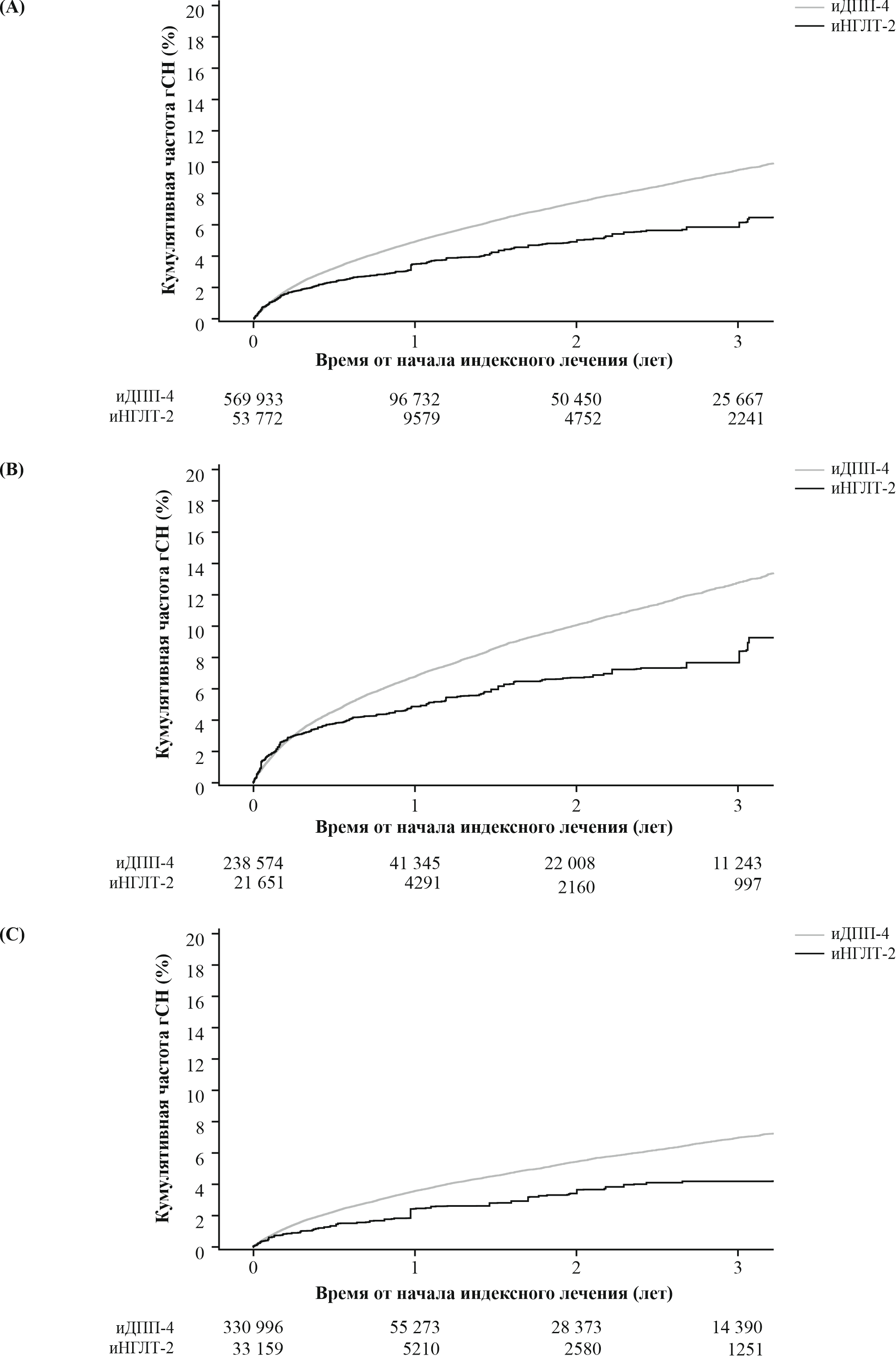 5. Рисунок 5. Кривая Каплана–Мейера кумулятивной частоты сочетания госпитализаций по поводу сердечной недостаточности (гСН) и/или смерти от всех причин в (А) полной когорте, (B) у пациентов с сердечно-сосудистыми заболеваниями (ССЗ) в анамнезе и (C) у пациентов без ССЗ в анамнезе. Взвешенная кумулятивная частота сочетания гСН и/или смерти от всех причин была ниже у пациентов, получавших ингибитор натрий-глюкозного котранспортера-2 (иНГЛТ-2), по сравнению с пациентами, получавшими лечение ингибитором дипептидилпептидазы-4 (иДПП-4), почти во всех временных точках после начала приема соответствующих препаратов в полной когорте и в обеих подгруппах по ССЗ. | |