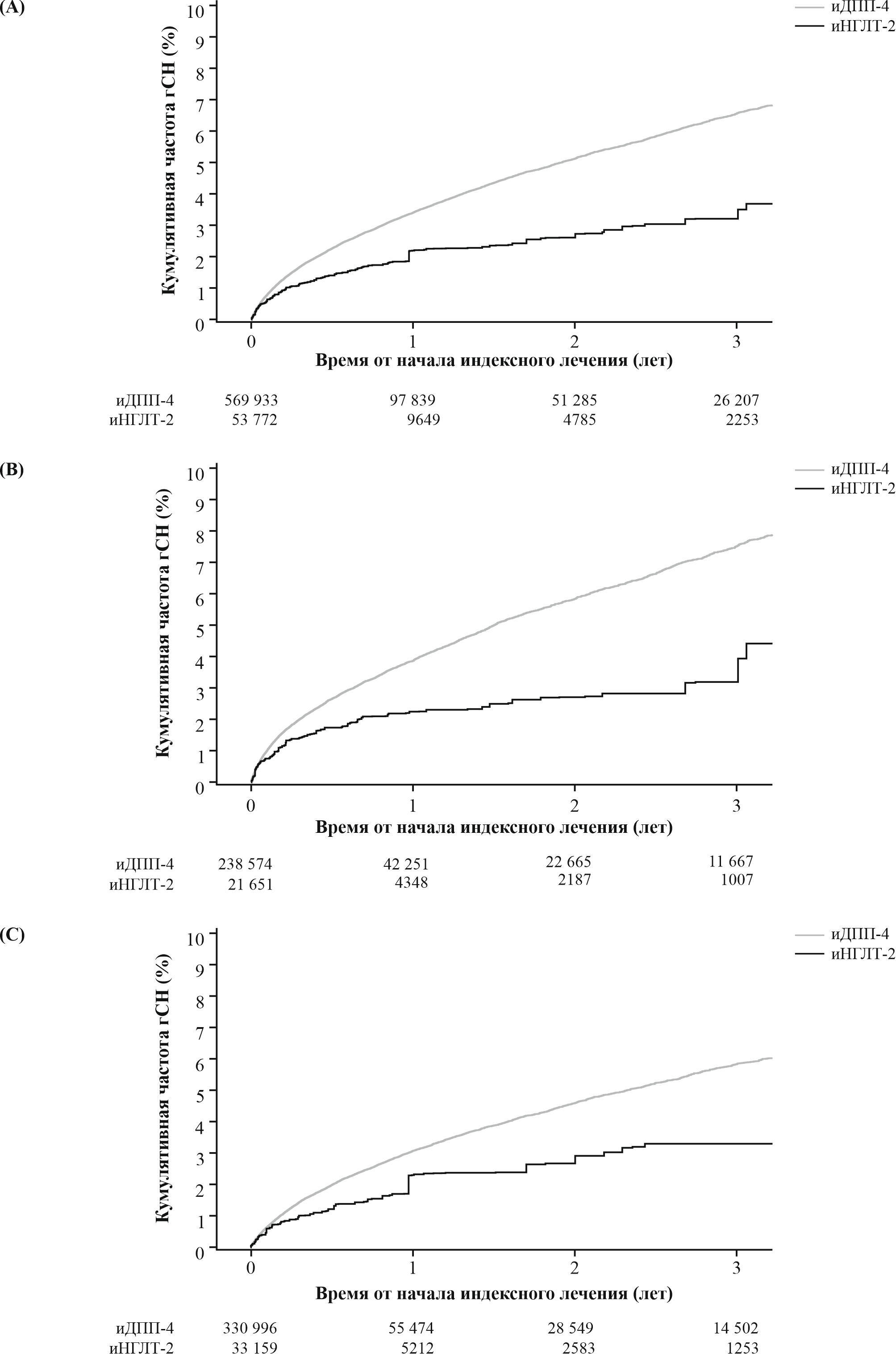 В анализе Каплана–Мейера взвешенная кумулятивная частота гСН оказалась выше у пациентов, получавших иНГЛТ-2, по сравнению с пациентами, получавшими иДПП-4, примерно до 60 сут после начала лечения для всей когорты и среди пациентов с ССЗ в анамнезе (рис. 3 A, B; табл. Д8 и Д9). Среди пациентов без ССЗ в анамнезе взвешенная кумулятивная частота гСН, как правило, была ниже у пациентов, получавших иНГЛТ-2, чем у пациентов, получавших иДПП-4, почти во всех временных точках, начиная с 90-х суток после начала лечения (рис. 3 C; табл. Д10).