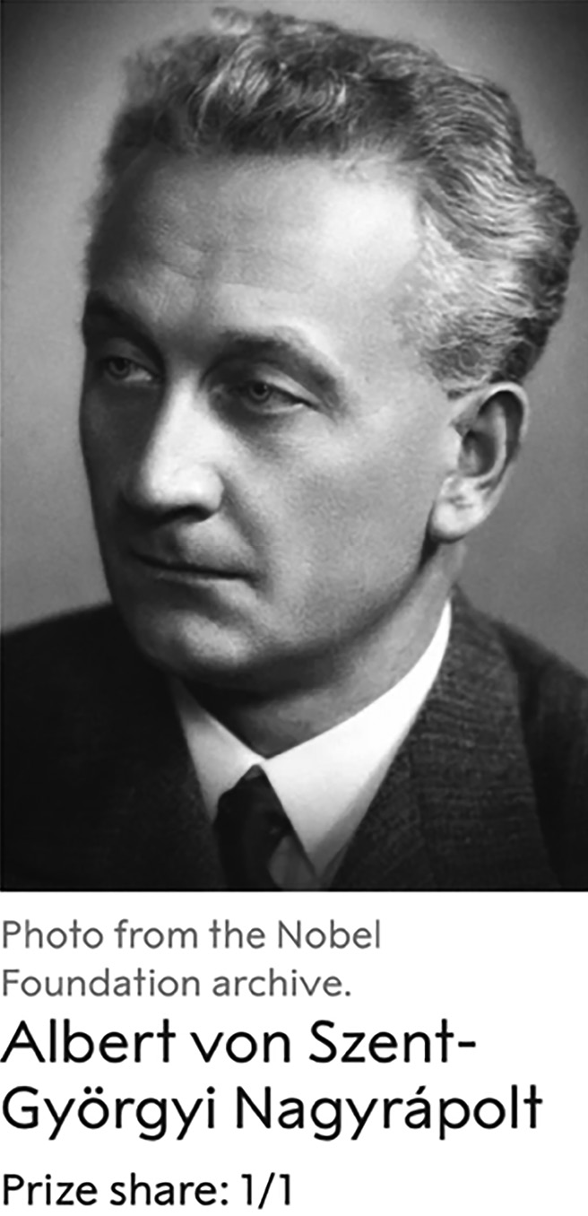 Основы биоэнергетики заложил американский биохимик венгерского происхождения Альберт Сент-Дьёрдьи (16.09.1893–22.10.1986) [5][6]. Интерес к клеточному дыханию и многочисленные эксперименты с капустой и цитрусовыми фруктами привели Сент-Дьёрдьи к выделению «гексуроновой кислоты» — известного витамина витамину С и фумарата — ключевого игрока позже открытого цикла лимонной кислоты [7][8]. Именно Альберт Сент-Дьёрдьи в 1937 г. был удостоен Нобелевской премии по физиологии и медицине «за открытия в области биологического окисления, связанные с изучением витамина С и катализа фумаровой кислоты» (рис. 3) [6].