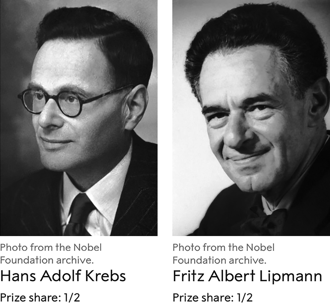Самое время вновь вернуться к первооткрывателю полного цикла трикарбоновых кислот — Хансу Кребсу. Вместе со своим наставником Отто Генрихом Варбургом, лауреатом Нобелевской премии по физиологии и медицине 1931 г. за достижения в метаболизме опухолей и дыхании клеток [10], Кребс был первопроходцем в изучении биохимической основы энергетического обмена клеток. Далее уже в Шефилдском университете Ханс Кребс вместе с Уильямом Джонсоном в течение многих месяцев проводили исследования по обнаружению потребления кислорода и производству энергии органическими кислотами, в том числе с цитратом, оксалоацетатом, сукцинатом, малатом и фумаратом (открытым Ф. Липманом). Наконец, доподлинно установив все звенья цепочки и их эволюционную важность, ученые опубликовали свои труды в Biochemical Journal (рис. 5) [11]. За эту фундаментальную работу Ханс Адольф Кребс вместе с Фрицем Альбертом Липманом были удостоены Нобелевской премии по физиологии и медицине в 1953 г. (рис. 6) [9].