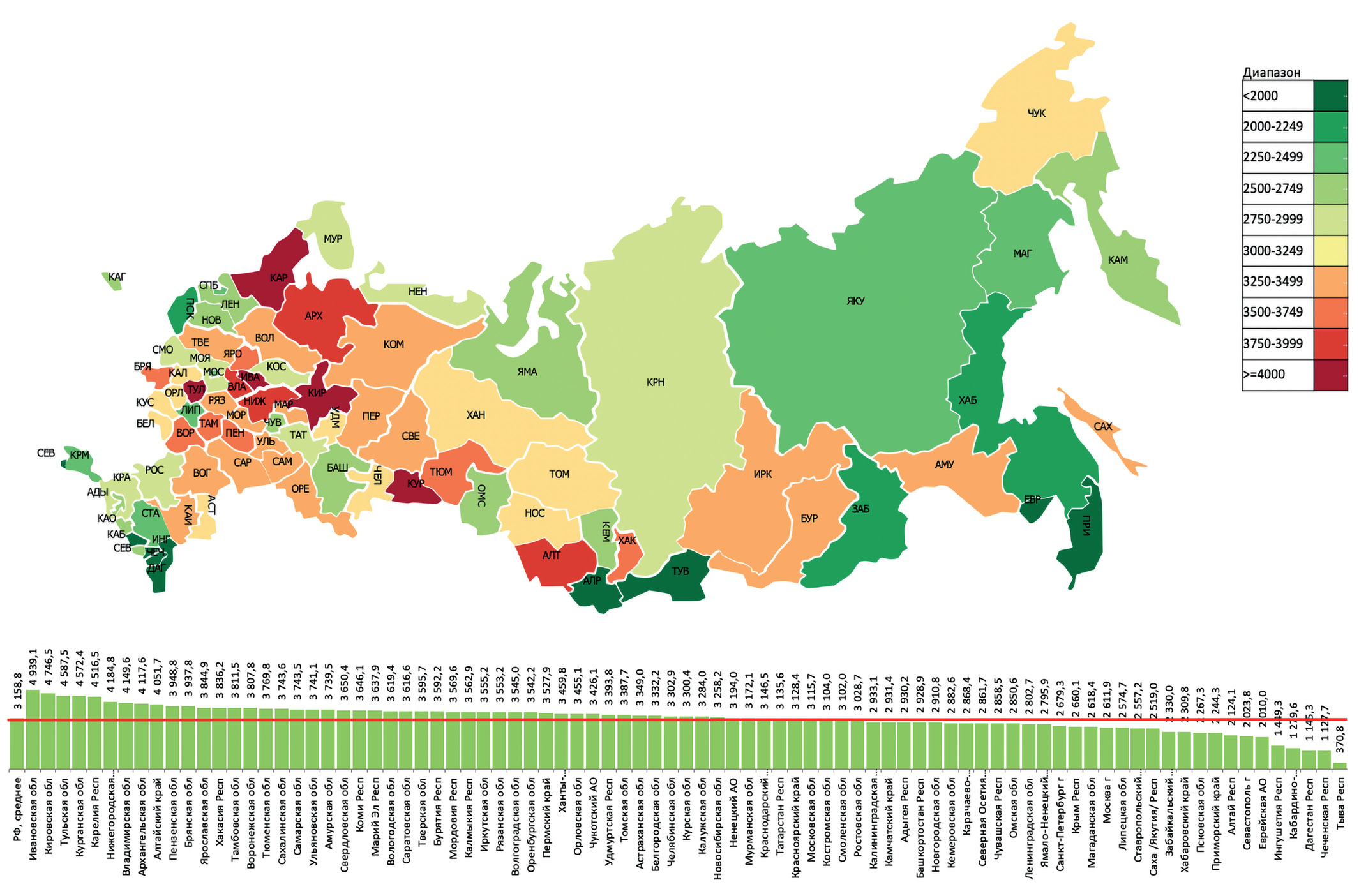 Рисунок 3. Распространенность сахарного диабета 2 типа на 100 тыс. населения, 85 регионов Российской Федерации, 01.01.2023 г.