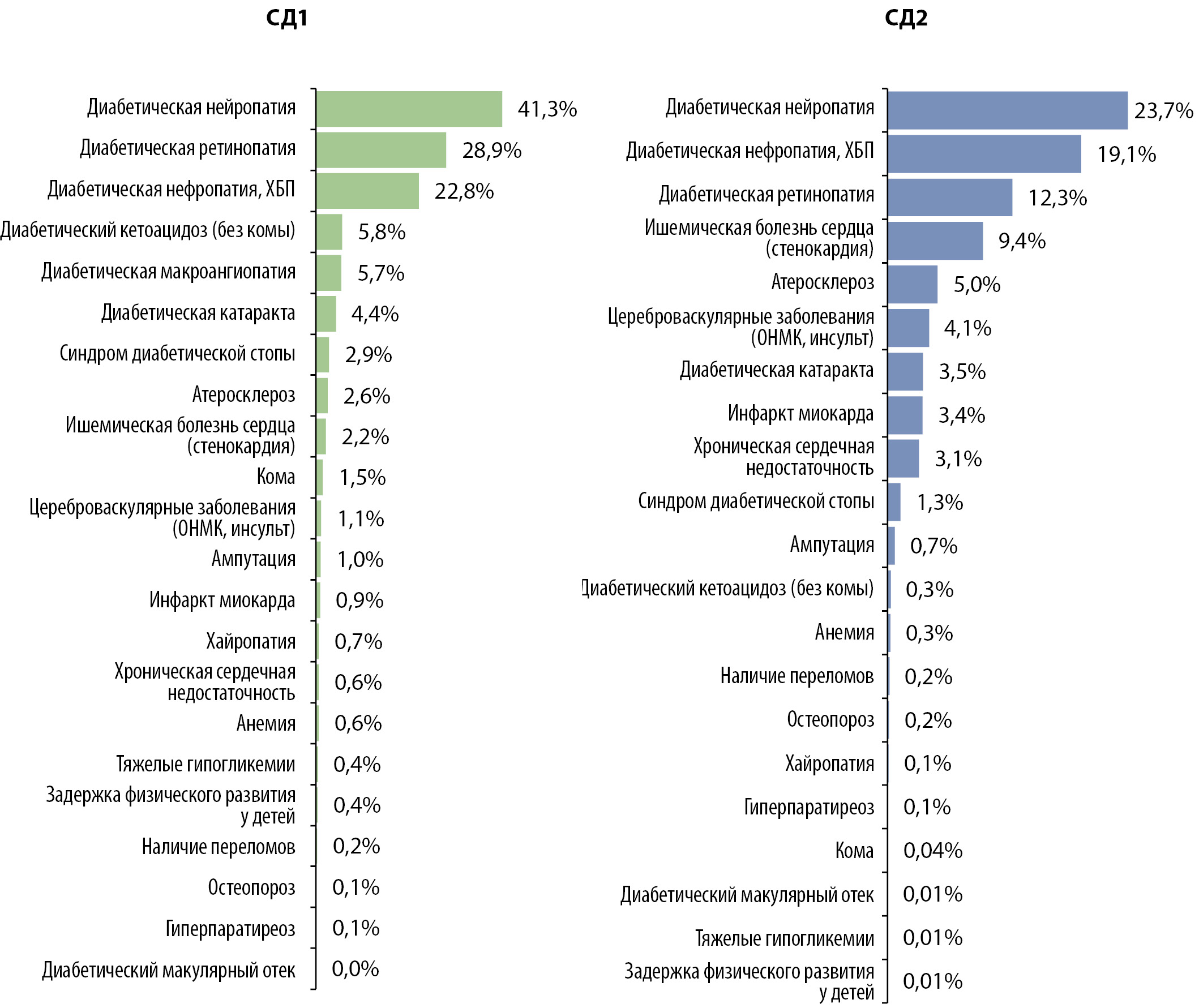 При анализе одномоментного среза структуры диабетических осложнений на 01.01.2023 г. остается прежнее распределение с наибольшей частотой микрососудистых осложнений: диабетическая нейропатия — 41,3 и 23,7%, диабетическая нефропатия, ХБП — 22,8 и 19,1%, диабетическая ретинопатия (ДР) — 28,9 и 12,3% при СД1 и СД2 соответственно (рис. 22). В отношении макрососудистых осложнений отмечена относительно меньшая частота: при СД1/СД2 частота ИБС 2,2%/9,4%, ИМ — 0,9%/3,4%. Учитывая общую численность пациентов с СД2 более 4,5 млн, количество пациентов с АССЗ и другими эквивалентами высокого сердечно-сосудистого риска — СН, ХБП и ампутациями составляет 1,91 млн человек.